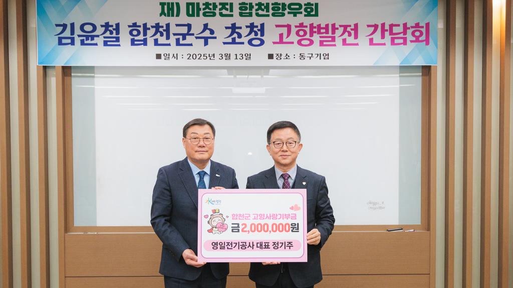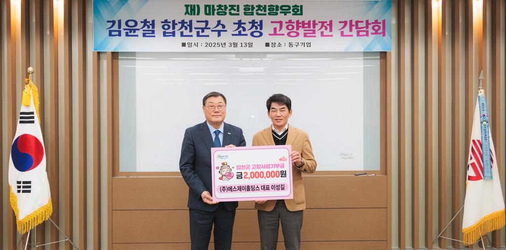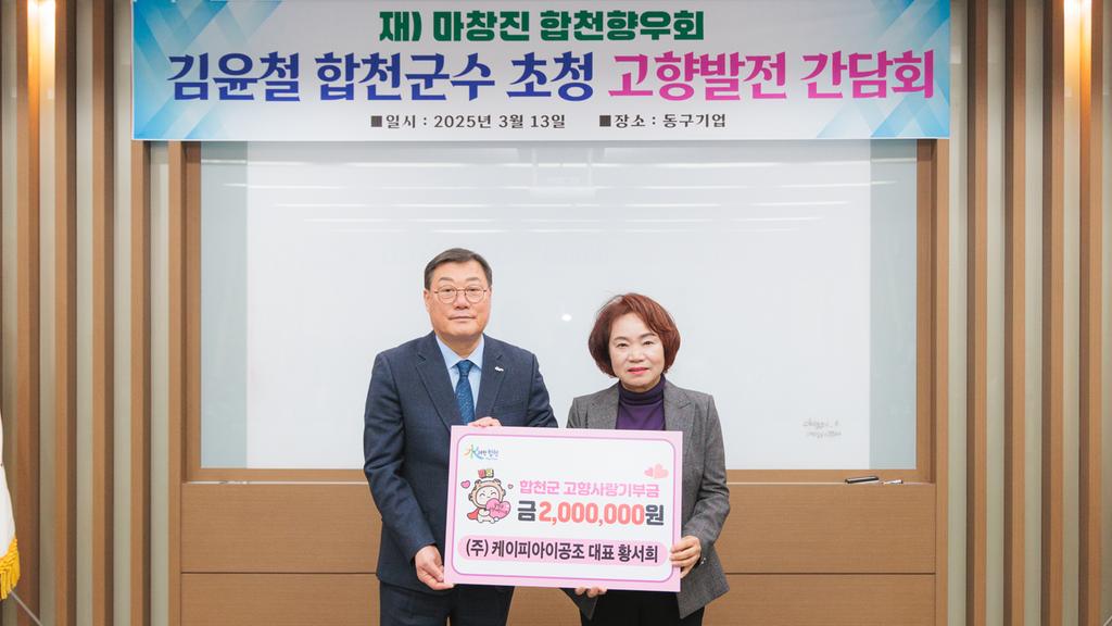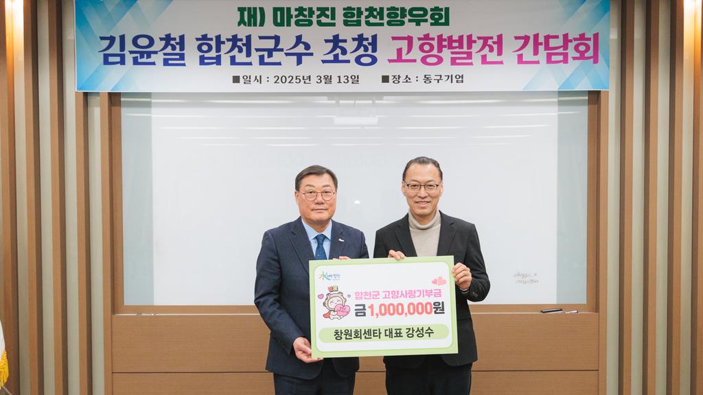 합천군(군수 김윤철)은 13일, 재창원합천군향우들과 고향발전 간담회 및 고향사랑기부금 기탁식을 가졌다고 밝혔다. 이날 행사는 류병현 향우가 대표로 재직 중인 창원시 소재 ㈜동구기업에서 열렸으며, 김윤철 합천군수와 정기주 재창원합천군향우회장을 포함한 향우 30여 명이 참석하였다.