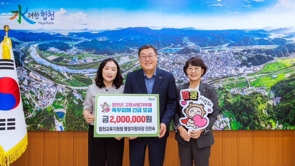 합천군(군수 김윤철)은 15일 군수실에서 합천교육지원청 진찬숙 행정지원과장이 고향사랑기부금 200만 원을 기탁했다고 밝혔다.