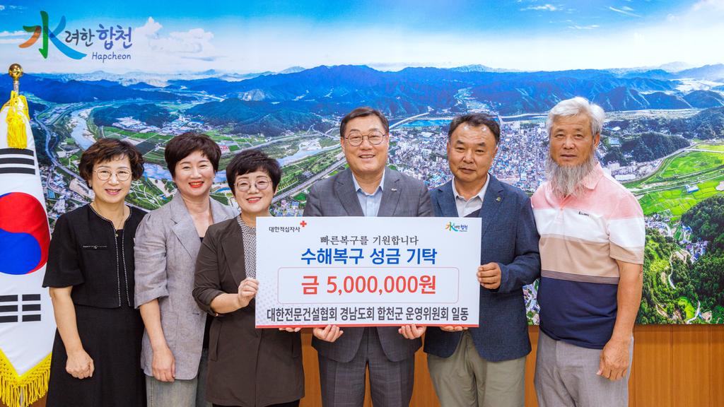 대한전문건설협회 경남도회(회장 김주생)는 22일 집중호우 피해로 어려움을 겪고 있는 합천군 수재민들을 돕기 위해 성금 500만원을 기탁했다.