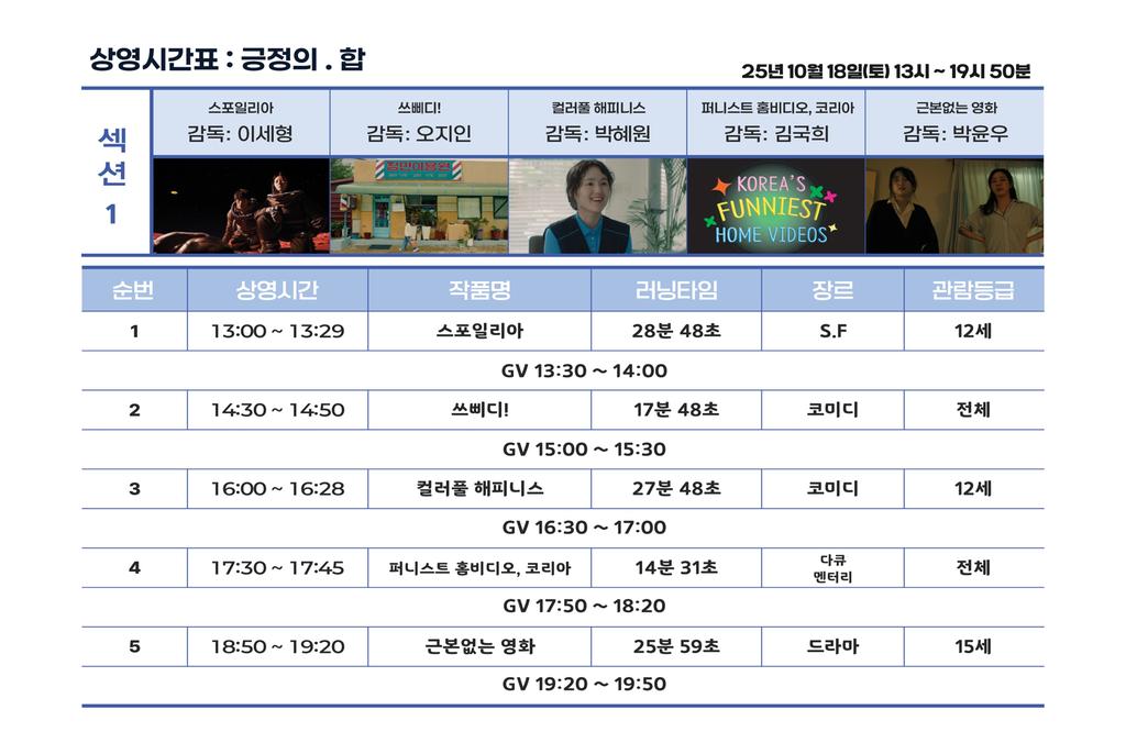 주요 프로그램으로는 섹션Ⅰ ‘긍정의 합’이 마련됐다. 불완전한 현실 속에서도 희망과 연대를 이야기하는 작품들을 선보이며, 현실의 무게를 마주하면서도 따뜻한 가능성을 찾아내는 영화들을 통해 오늘을 살아가는 이들에게 공감과 위로를 전한다. 특히, 영화진흥위원회 독립예술영화 단편 제작지원작인 <스포일리아>와 할리우드 Indian Paintbrush Productions 제작지원 졸업작품인 <쓰삐디!> 등 국내외에서 주목받은 단편들이 상영된다.