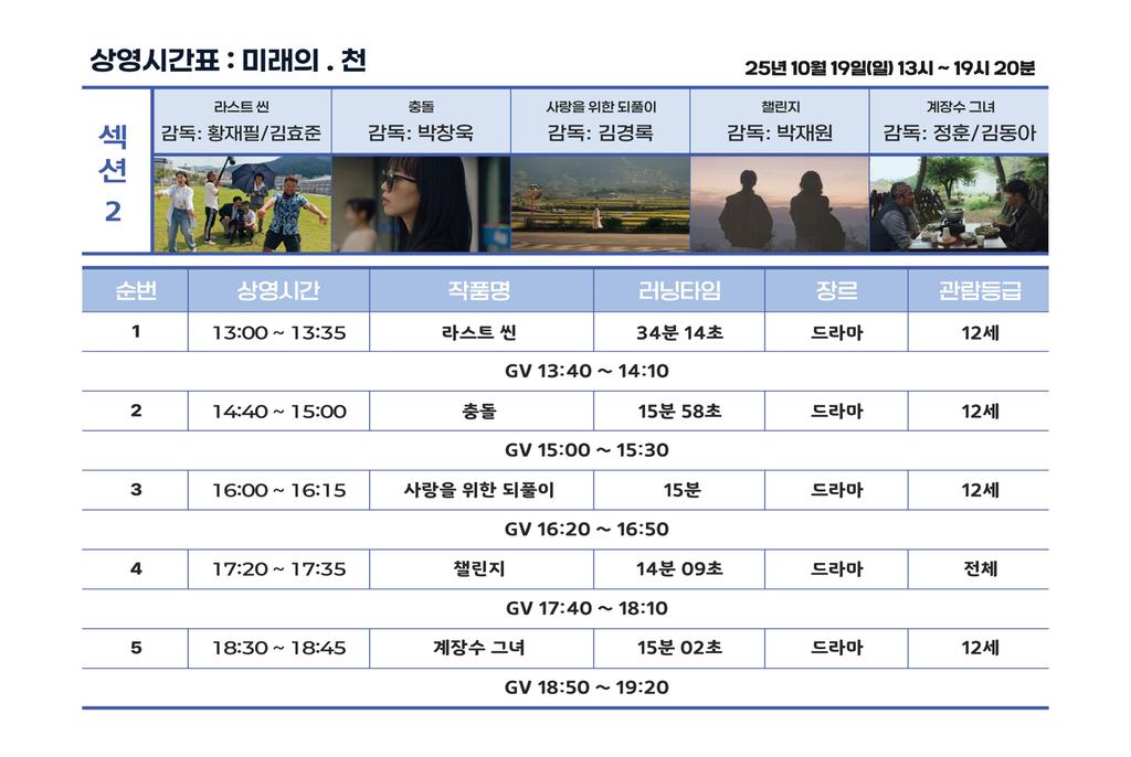 섹션Ⅱ ‘미래의 천’은 올해 신설된 프로그램으로, 2024 필름챌린지 수상작과 참여 감독들의 신작을 중심으로 구성된다. 세대와 장르, 형식의 경계를 넘어서는 실험적 시도를 담아내며, ‘내일의 영화 언어’를 탐색하는 장이 될 예정이다. 불확실한 시대일수록 창작자들의 상상력과 도전 정신이 빛나는 만큼, 합천영화제가 지향하는 ‘내일의 예술, 내일의 영화, 내일의 관객’의 비전을 선명히 보여주게 된다.