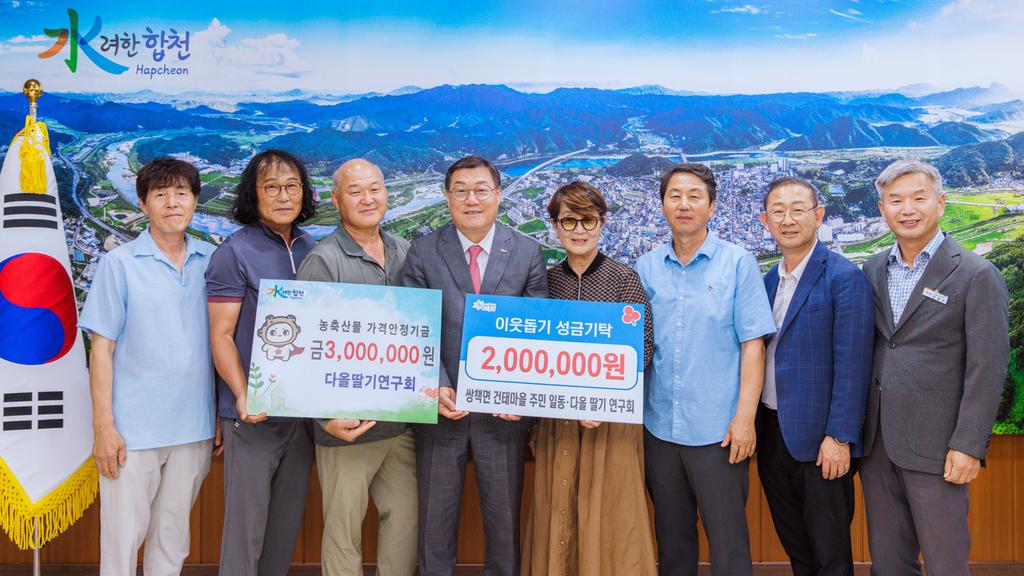 합천군(군수 김윤철)은 23일, 합천군 쌍책면 건태마을(이장 전민자) 주민 일동과 쌍책 다올 딸기 연구회(회장 전송운) 회원들이 합천군청을 방문하여 이웃돕기 성금 200만원을 기탁했다고 밝혔다.