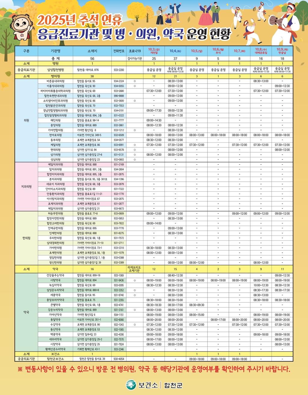 응급의료 분야에서는 명절 연휴 기간 응급진료대책 상황실을 운영하고, 응급진료기관 1개소와 문 여는 병·의원 24개소, 약국 15개소의 운영 현황을 점검했다. 호흡기 질환 등 감염병 발생을 모니터링했으며, 합천군보건소는 10월 5일부터 7일까지 3일간 비상진료를 실시했다.