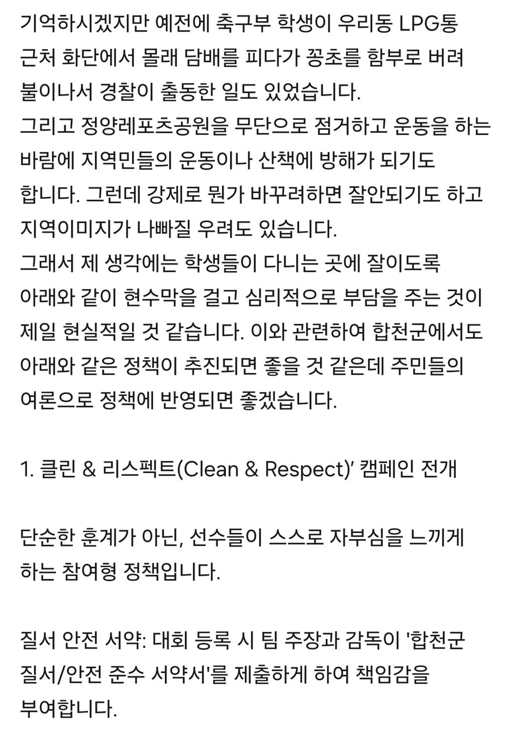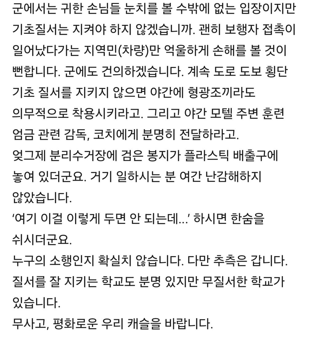 참고로 저희 입주민의 민원성 글을 첨부하오니 합천의 이미지가 손상 안되는 수준에서 대회 관계자에게 전달하여 전파 부탁드립니다.