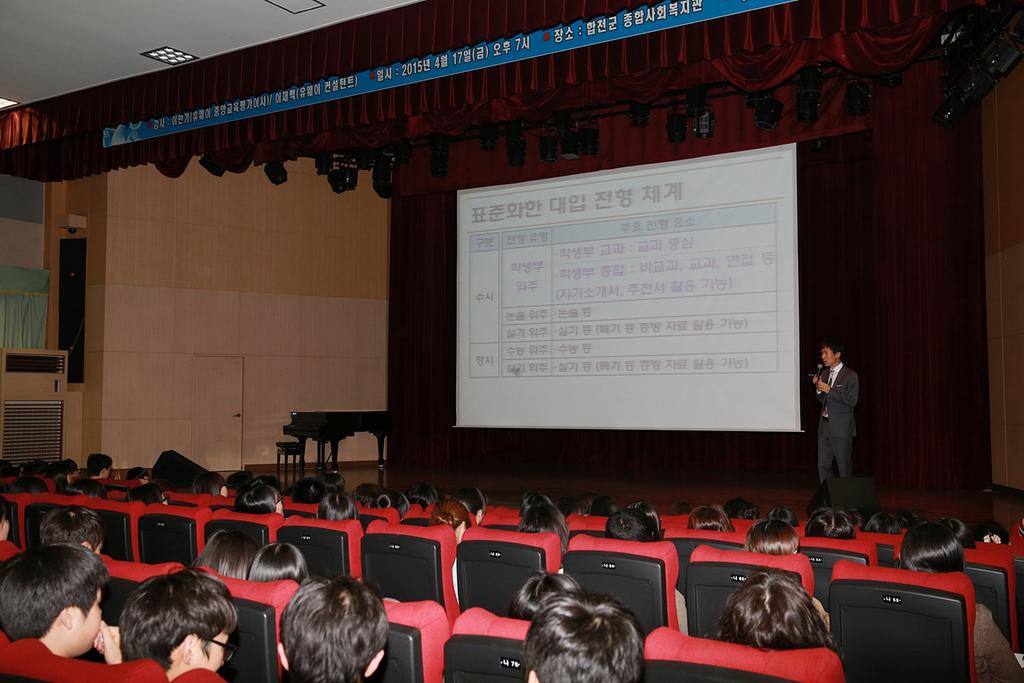 합천군(군수 하창환)은 지난 17일 저녁 7시부터 2시간 30분 동안 합천군 종합사회복지관 3층 대강당에서 유웨이 중앙교육평가연구소 이만기 평가 이사를 초청, ‘이만기 이사에게 들어보는 격이 다른 대학 입시전략 설명회’란 제목으로 2016~2018학년도 대학 입시전략 설명회를 개최했다.