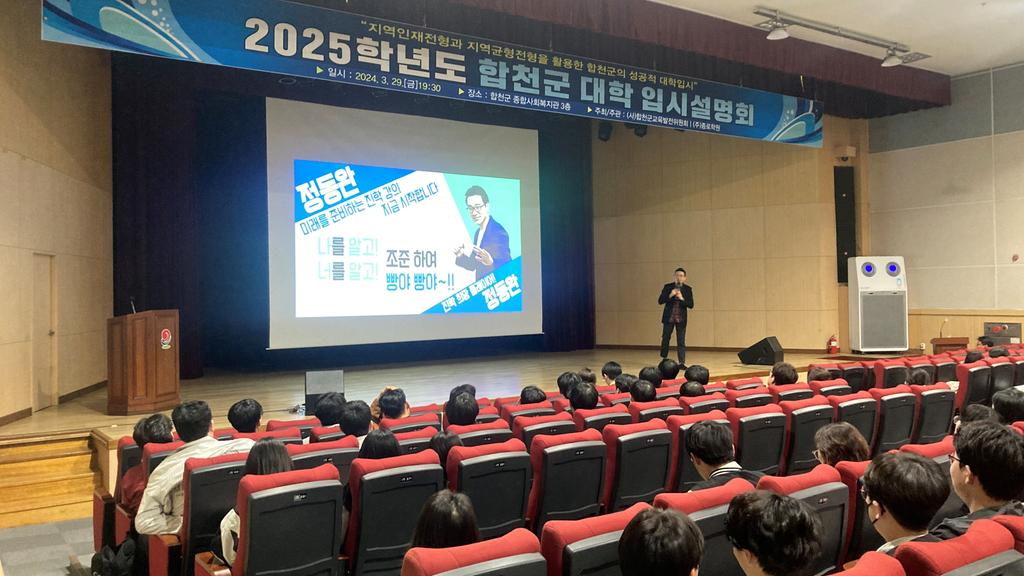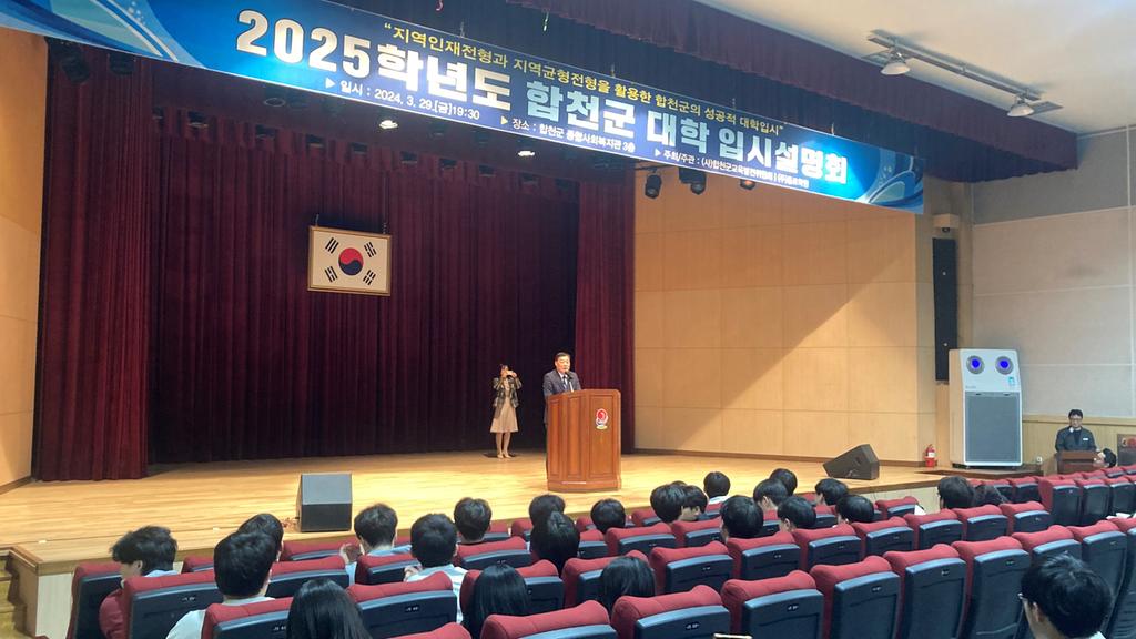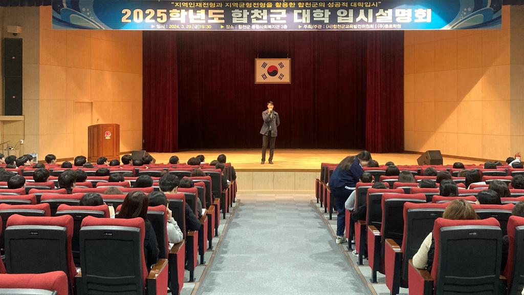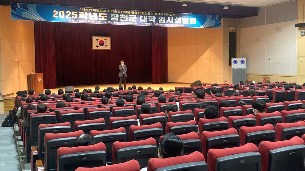 (사)합천군교육발전위원회(이사장 김윤철)는 지난달 29일 합천군종합사회복지관 대강당에서 학부모, 학생, 교육관계자 등 300여명이 참석한 가운데 2025학년도 대학 입시 설명회를 개최했다.