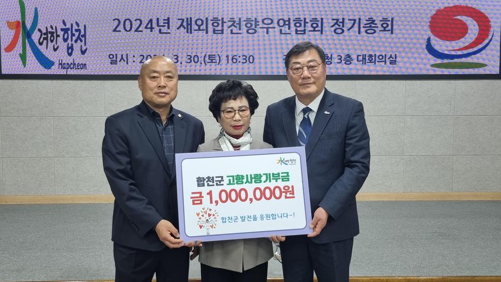 지난달 30일 합천군청 대회의실에서 재외합천향우연합회 2024년도 정기총회가 개최된 가운데, 임호선 재구황강산악회장이 100만원, 홍정해 재부향우회 여성회장이 100만원을 기탁했다. 또 재부향우회 여성회 김복연 고문, 서말준 고문, 문숙자 고문 등 많은 향우들이 기부하며 고향 사랑에 동참했다.