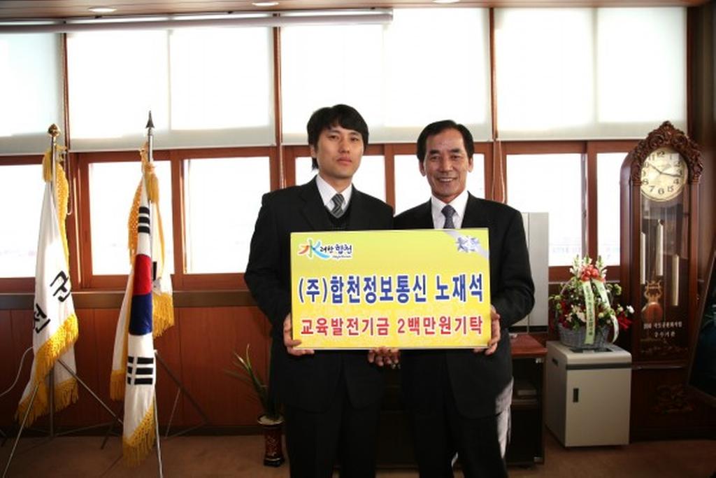 <p style="font-size: 13pt; margin: 0pt 13.53pt 0pt 14.07pt; color: #000000; text-indent: 0pt; line-height: 150%; font-family: "휴먼명조"; text-align: justify"><span style="font-size: 13pt; color: #000000; line-height: 19.5pt; font-family: 휴먼명조,한컴돋움; letter-spacing: 0pt; text-align: justify"> 11일 오전 10시 가회면 덕촌리 홍성표 씨와 (주)합천정보통신의 대표 노재석 씨가 (사)합천군교육발전위원회(이사장:하창환)를 방문하여 향토인재 육성을 위해 써달라며 교육발전기금 각 100만원과 200만원을 기탁하였다.</span></p>