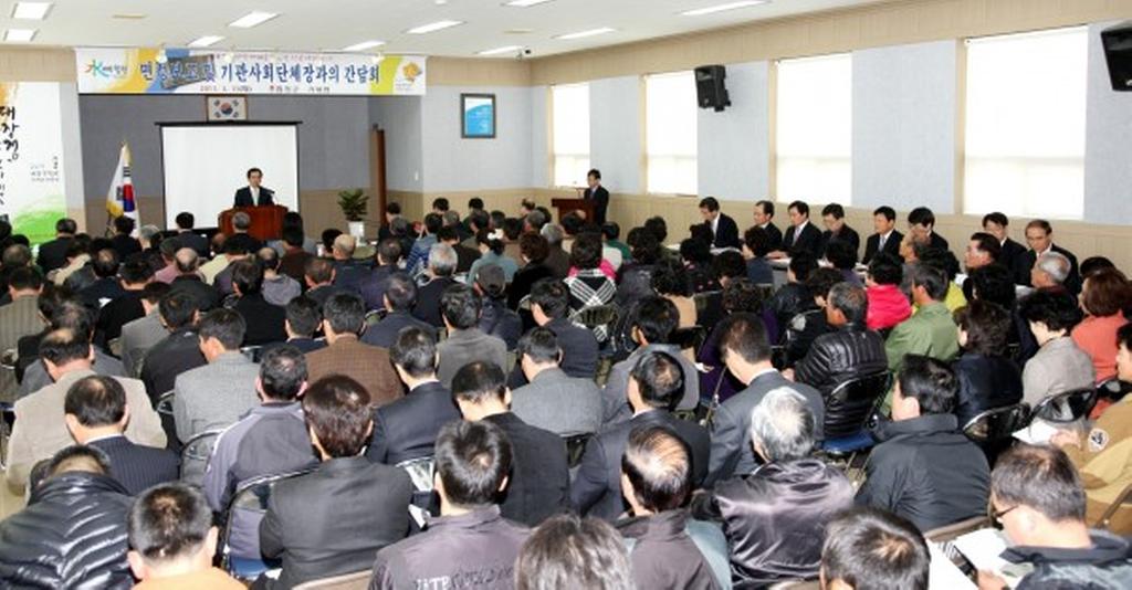 읍면의 기관사회단체장 및 각계각층 지역주민들과 대화의 시간을 가지면서 여과 없는 민생현장의 소리를 듣기위해 민선5기 군수 취임후 처음으로 “읍면정보고 및 기관사회단체장 간담회”를 가지게 되었다.