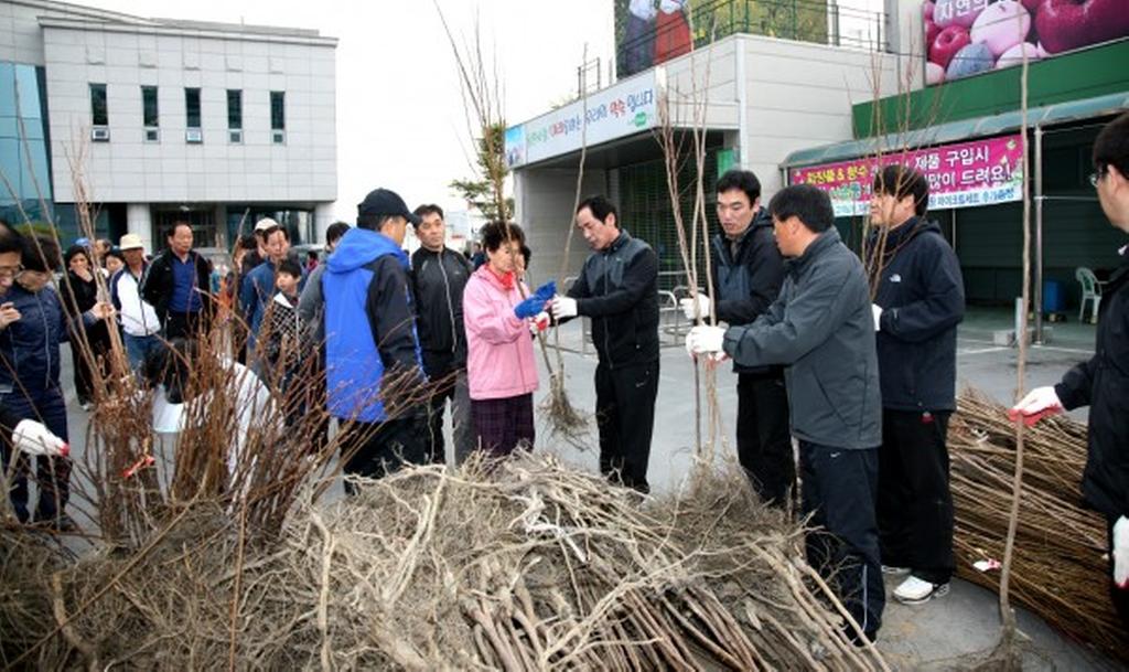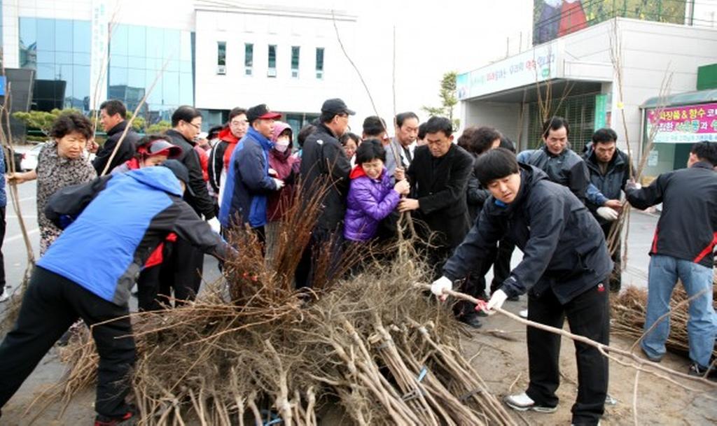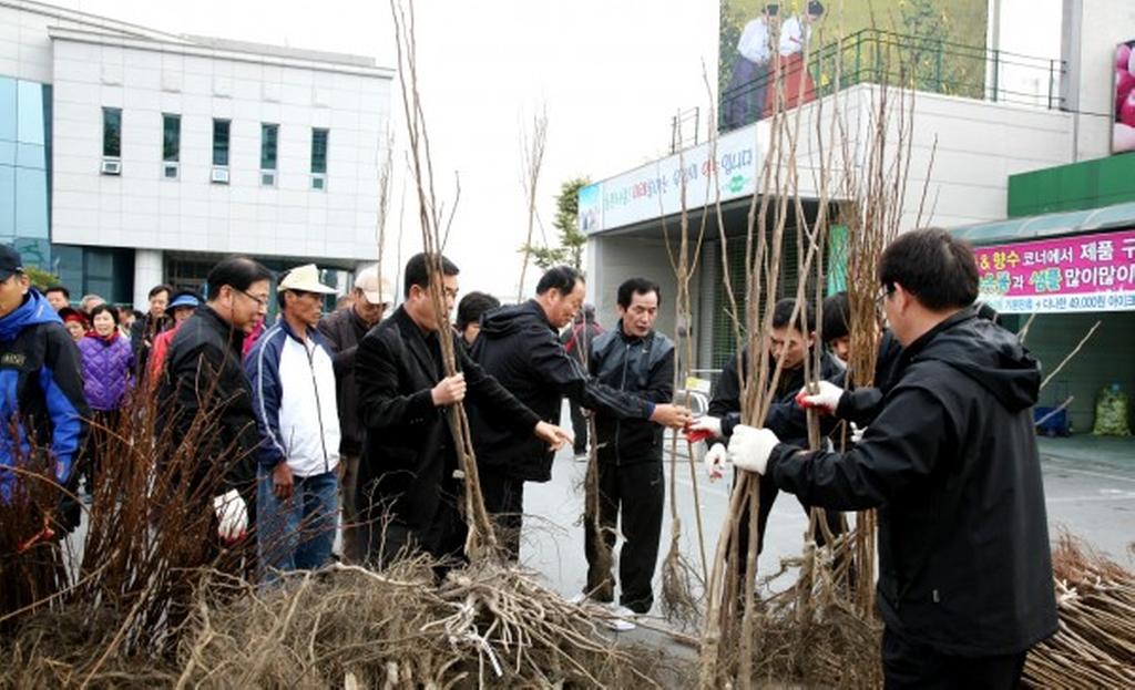 금년 나무 나누어주기 행사는 봄철 나무심기가 본격적으로 시작되는 시기인 만큼, 생활주변 자투리땅 및 유휴지 등에 다양한 녹색 공간 조성을 위하여 호두, 자두, 헛개, 대봉, 가죽나무 5종 8,800본의 나무를 자체 구입과 더불어 합천군산림조합의 후원으로 준비하였다.
