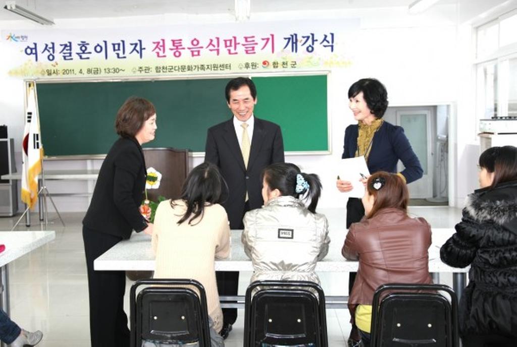 합천군 은 8일 합천여자중학교 요리실습실에서 하창환 군수, 정경리 여성단체협의회장을 비롯한 여성단체회장, 여성결혼이민자 25명 등 40여명이 참석한 가운데 여성결혼이민자 전통음식만들기 개강식을 가졌다.
