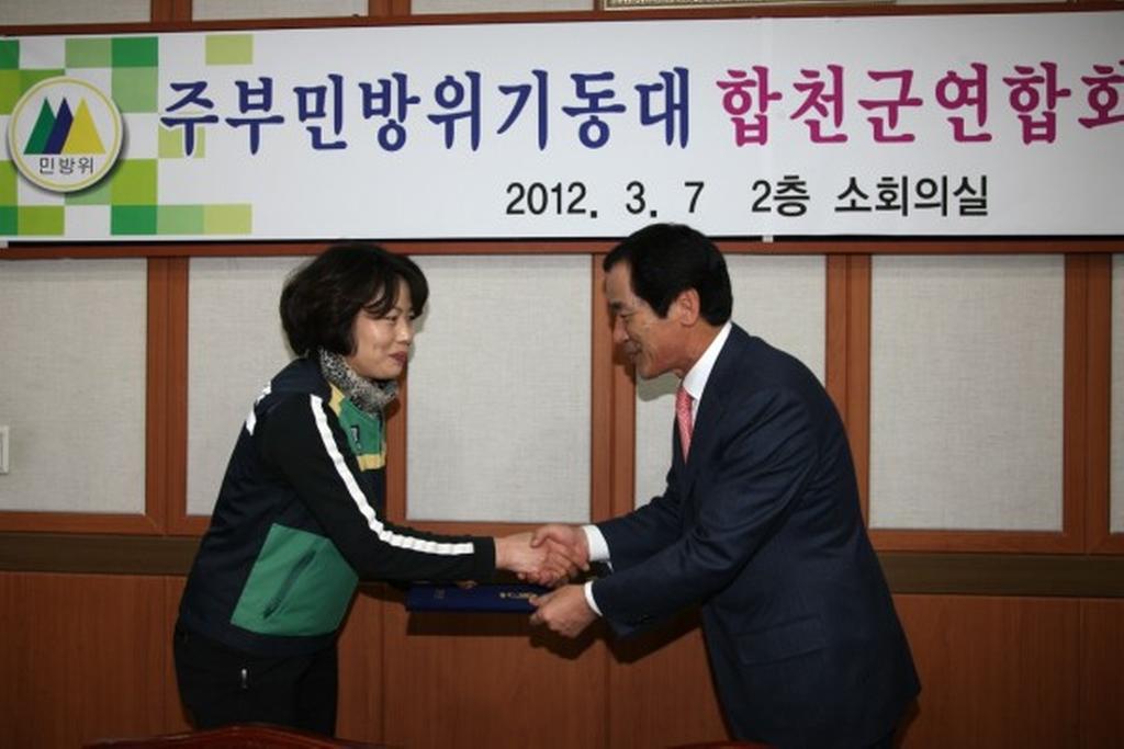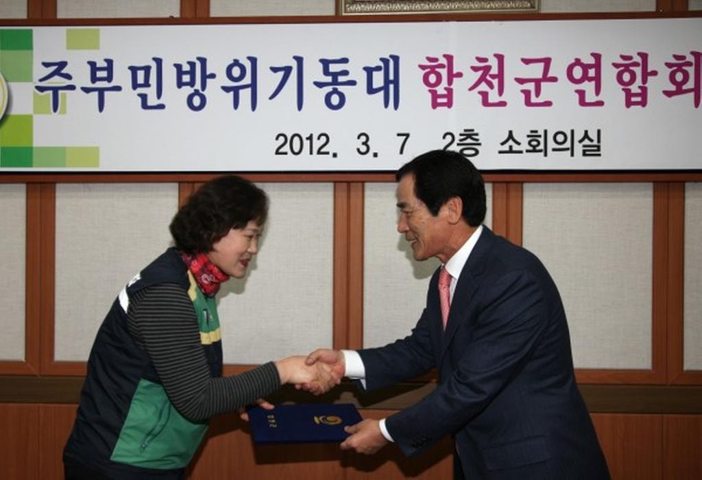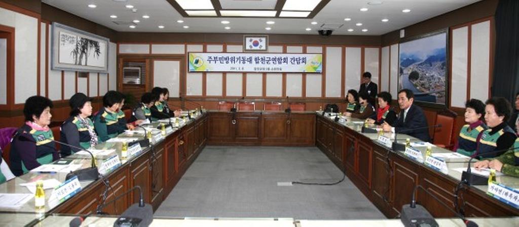 주부민방위기동대 합천군연합회(회장 박윤옥)는 지난 7일 군청 소회의실에서 하창환 군수를 비롯한 주부민방위대 임원 등 20여명이 참석한 가운데 합천군 주부민방위기동대 간담회를 가졌다. 이번 간담회에서는 2012년 주부민방위기동대 주요 활동계획과 매년 실시하고 있는 민방위 훈련 및 각종 재난 관련 훈련 참여를 비롯해 노인요양원 봉사활동, 병영체험 등 생활민방위 전반에 대한 토의를 가졌다. 특히, 다음달 20일로 계획돼 있는 “합천군 주부민방위기동대 결의대회”는 대원들의 단결력을 증진시키고 자율 참여 분위기 확산으로 지역민방위의 활동 역량을 제고시킬 수 있는 좋은 기회가 될 것으로 기대되고 있다.