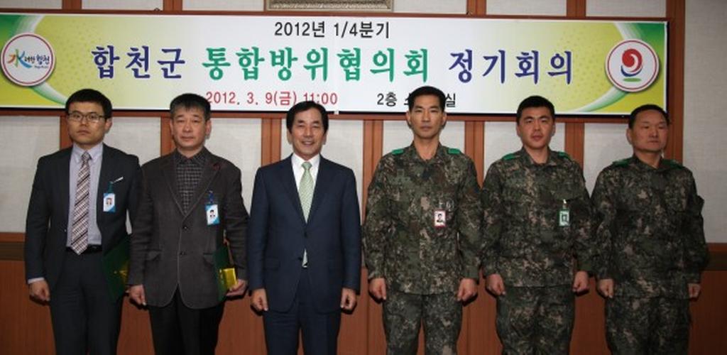 합천군은 9일 군청 소회의실에서 하창환 합천군수를 비롯해 군부대·경찰서 등 군 통합방위협의회 위원 20여명이 참석한 가운데 2012년 1/4분기 합천군 통합방위협의회를 개최했다. 이날 회의에서는 국정원 경남지부의 ‘북한의 대남 위협실태 및 전망’ 동영상 시청에 이어 육군 제5870부대4대대의 ‘통합방위태세 추진방향’, 합천군의 ‘2012 통합방위태세 확립보고’ 등 기관별 보고와 지역단위 통합방위 태세 확립에 대한 토의 등으로 진행됐다. 이날 회의에서 합천군 통합방위협의회 의장인 하창환 군수는 “올해는 핵 안보정상회의, 여수엑스포 등 국제적 행사와 북한의 권력 변화 등 국가적으로 중요한 시기이다”면서 “민·관·군·경이 통합방위 태세 강화를 위해 함께 노력하자“고 당부했다.