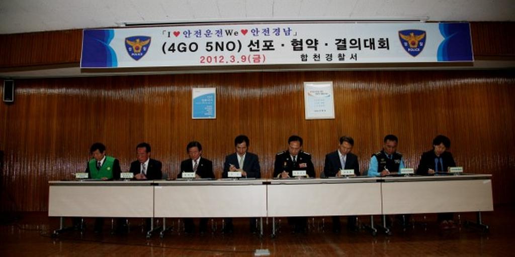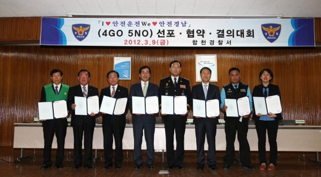 이날 선포식에서는 유관기관과 협력단체의 적극적인 동참 및 협력을 유도하기 위해 합천군청을 비롯한 7개 단체들과 교통사고 줄이기를 위한 업무지원 협약도 체결했다. 이에 따라 「I LOVE 안전운전 WE LOVE 안전경남」의 실천방안으로 ‘4GO 5NO' 100만인 교통질서 확립 서명운동을 벌여 나가기로 했다.