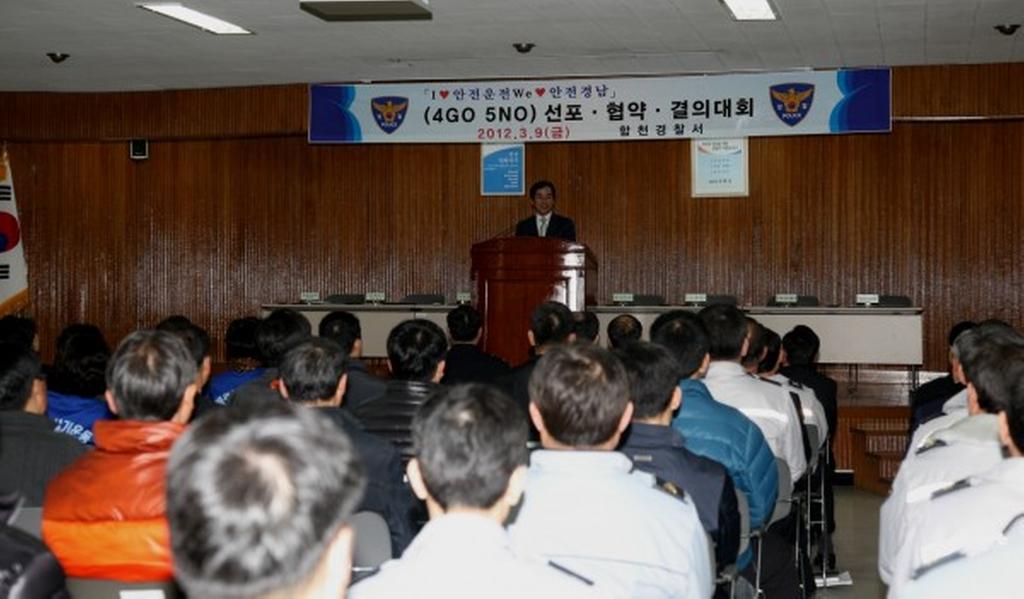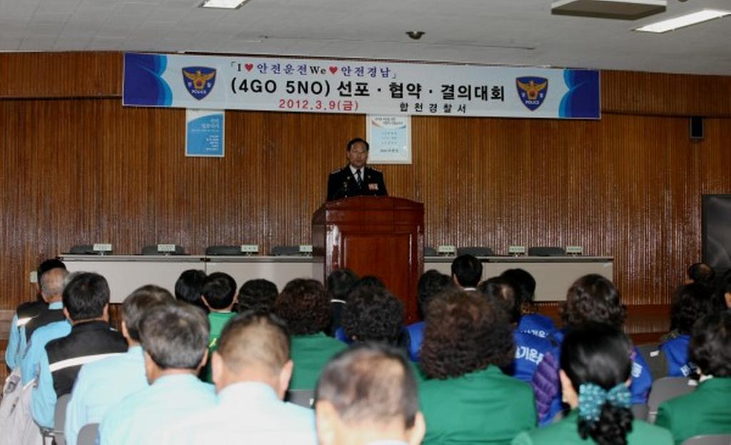 김흥진 합천경찰서장은 “4GO 5NO 운동은 교통사고로부터 군민들의 귀중한 생명과 재산을 보호하고 올바른 교통문화 정착을 위한 운동인 만큼 군민들의 적극적인 참여와 실천으로 2012년을 불편 없는 교통, 사고 없는 교통환경을 달성하는데 노력하자“며 참석한 각 기관단체장 및 경찰관들에게 적극적인 동참을 당부했다.