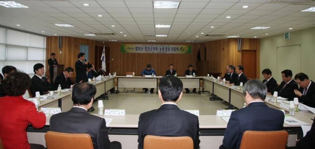 합천군은 9일 지역 농산물 마케팅 활성화를 통한 경쟁력을 강화하고 국가간 지역간 날로 경쟁이 치열한 어려운 현시점에 농업·농촌문제에 공동대응 할 필요성에 인식을 같이하고 협력체계 구축을 위한 간담회를 가졌다.