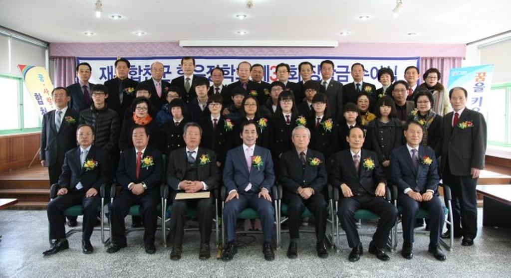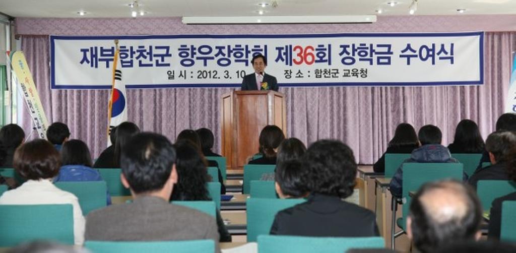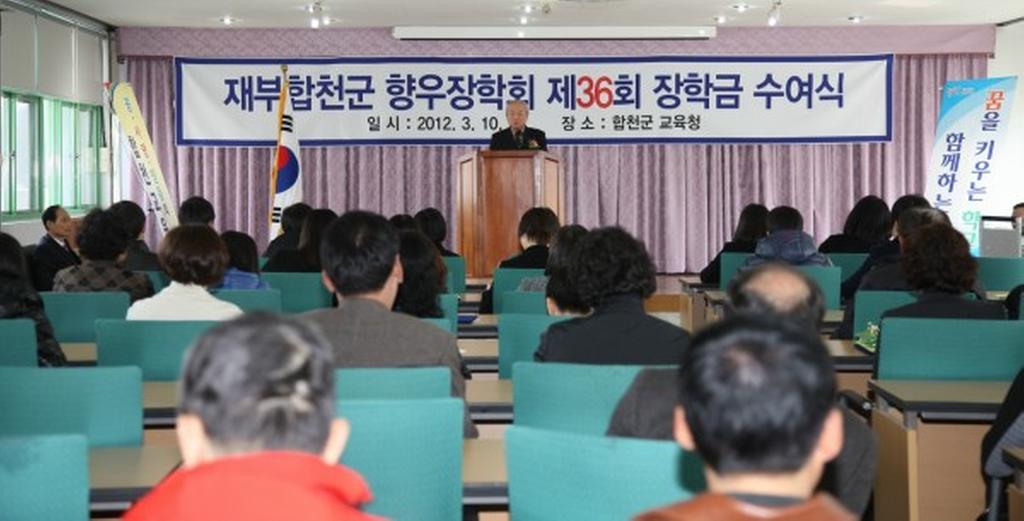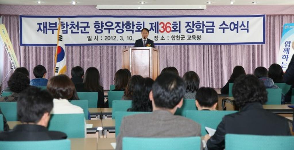 올해로 36회 장학금 전달식을 개최한 재부합천군향우장학회는 1975년 창립되어 현재 330명의 이사가 활동하고 있으며 2011년까지 총 3억 9천9백만원의 장학금을 전달하여 향토인재육성을 위해 힘쓰는 모범적인 장학회로 손꼽히고 있다.