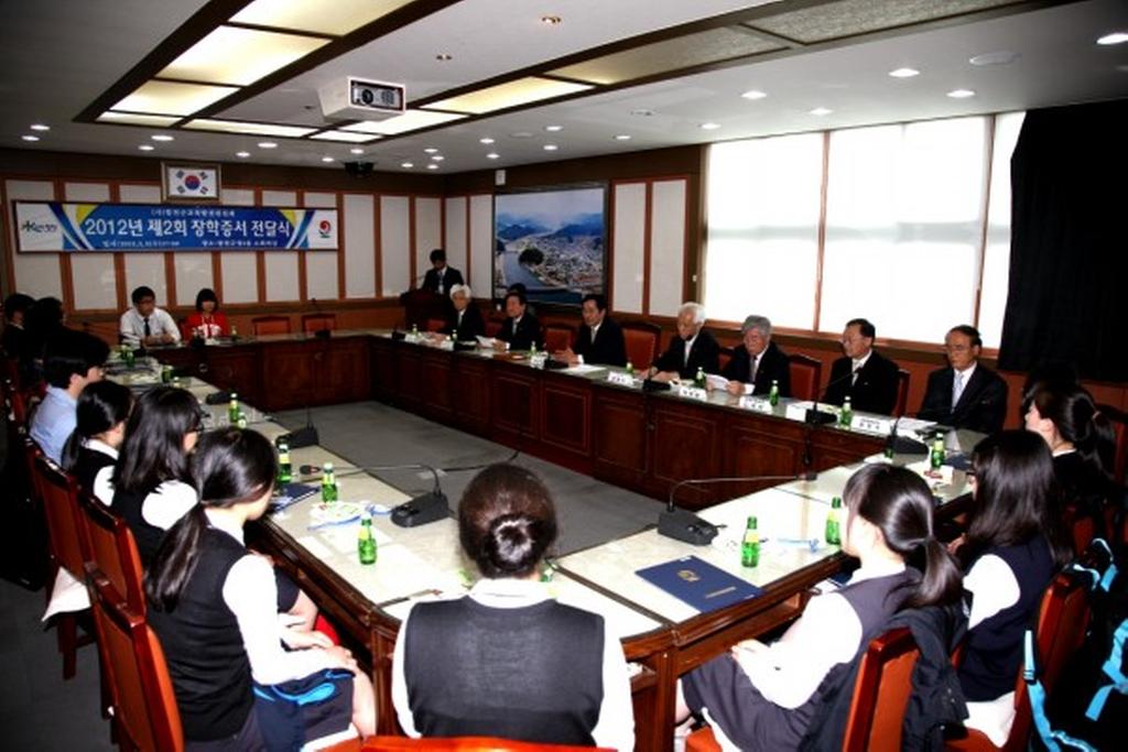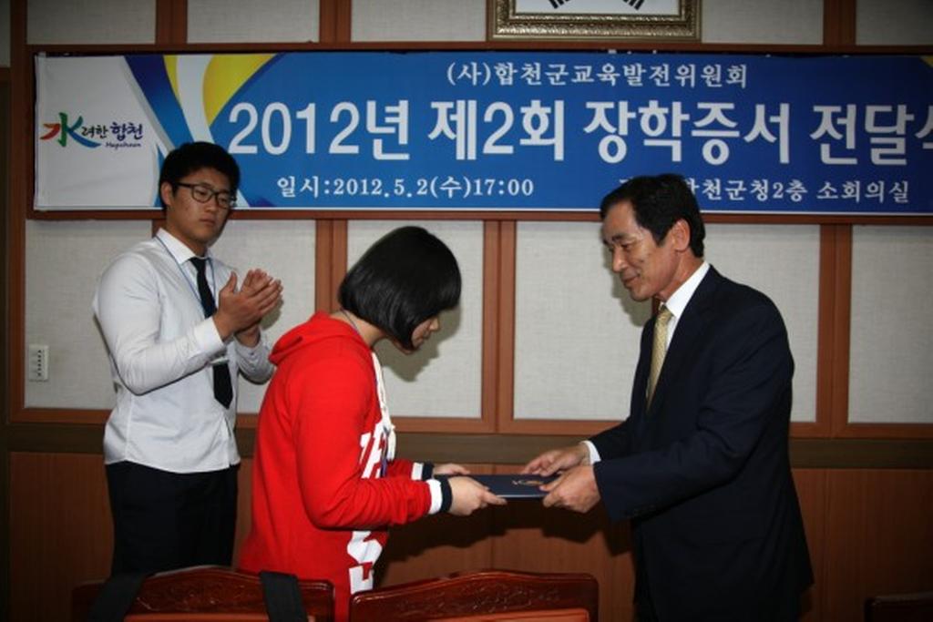 (사)합천군교육발전위원회는 2일 오후 5시 합천군청 소회의실에서 학교장 추천을 받은 예체능 특기 장학생 등 총 106명을 대상으로 2012년 제2회 장학증서 전달식을 열었다.