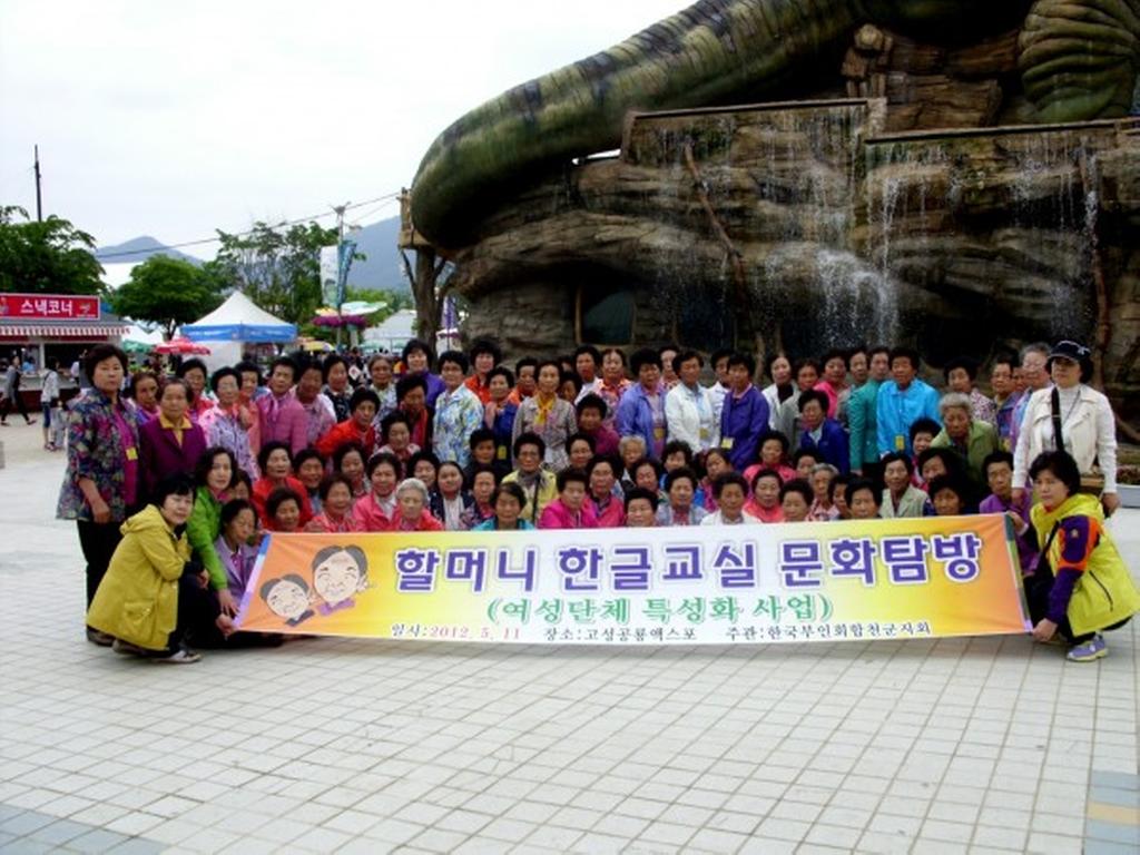 여성단체협의회 특성화사업의 일환으로 5월 가정의 달을 맞아권역별(남부,중부권) 할머니한글교실 어르신들을 격려코자 정심회와 한국부인회에서는 최고령 노정자할머니(86세)외 149명의 어르신들을 모시고 회원 10여명이 도우미로 참여하여 고성 공룡세계엑스포 및 삼천포일원으로 견학을 다녀왔다.