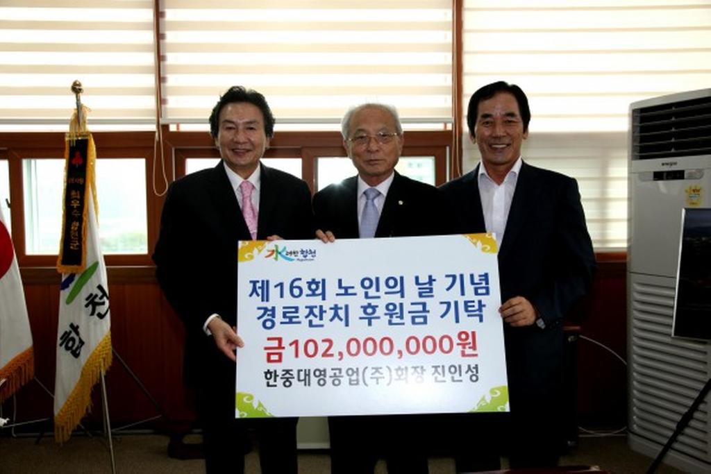 합천군 율곡면 임북농공단지 내 한중대영공업(주) 진인성 회장은 2012. 9. 4일 오전 합천군청를 방문하여 제16회 노인의 날 기념 경로잔치를 위해 합천군노인회지회에 1억2백만원(읍·면별 6백만원씩)의 “합천사랑 상품권”을 기탁하였다.