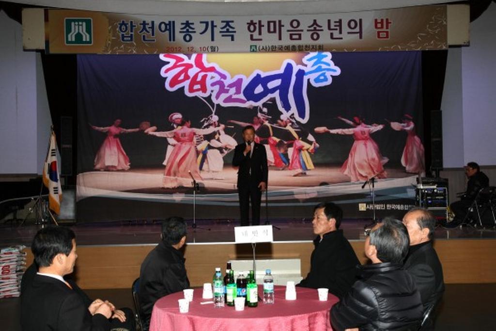 본 행사에 참석한 허홍구 군의장은 축사를 통해“연말연시에 이같이 뜻깊은 행사를 개최하게 된 합천예술인들의 노고를 치하하며, 앞으로는 예술의 발전이 국가와 지역사회 발전을 앞당김은 물론 향후 문화수준의 척도가 될 것”이라고 전하였다. 그리고 하상도 예총합천지회장은 인사말을 통해 “많은 분들의 도움 덕분에 합천예총이 지금까지 발전해왔음에 감사드리며 앞으로도 지속적인 격려와 지원을 당부드린다”고 전하였다.