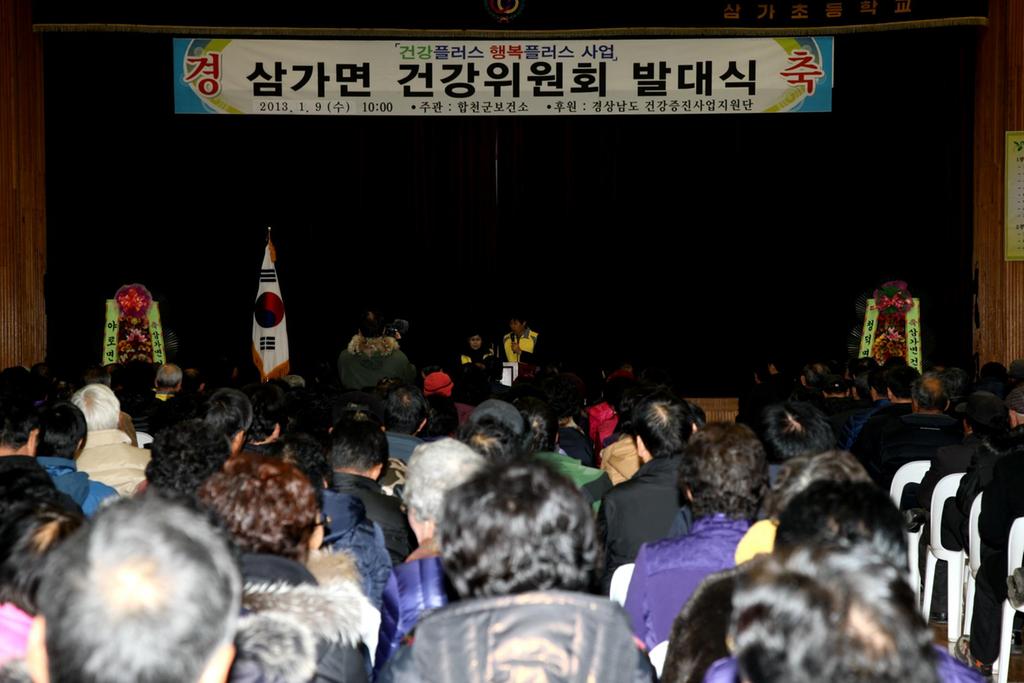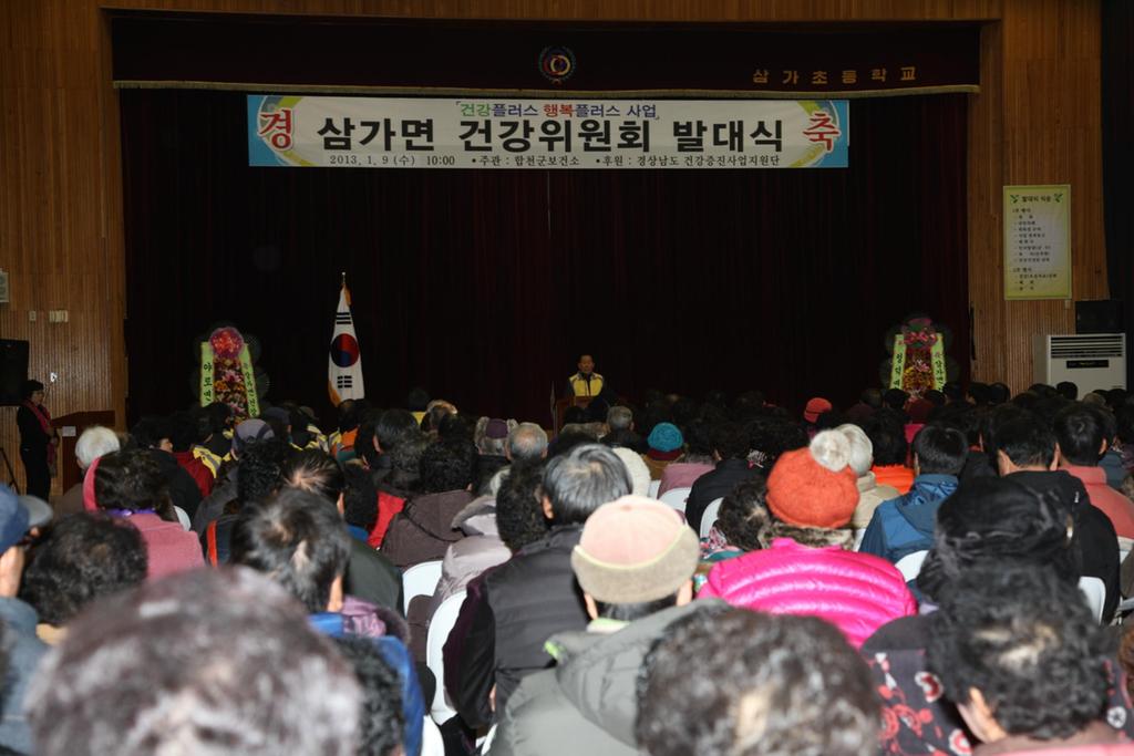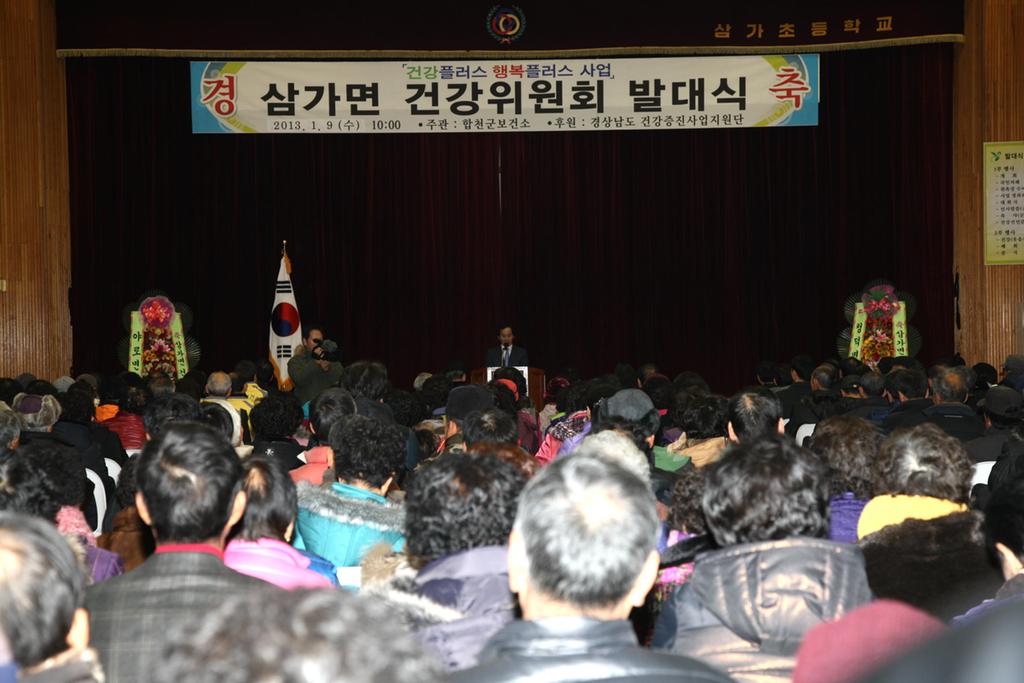 합천군은 9일 오전 10시 삼가초등학교 실내체육관에서 하창환 군수를 비롯한 기관·사회단체장, 지역주민 등 300여명이 참석한 가운데 건강플러스 행복플러스 사업의 일환으로 건강취약지역 주민의 건강불평등 해소ㆍ완화하기 위한 삼가면 건강위원회 발대식을 개최했다.