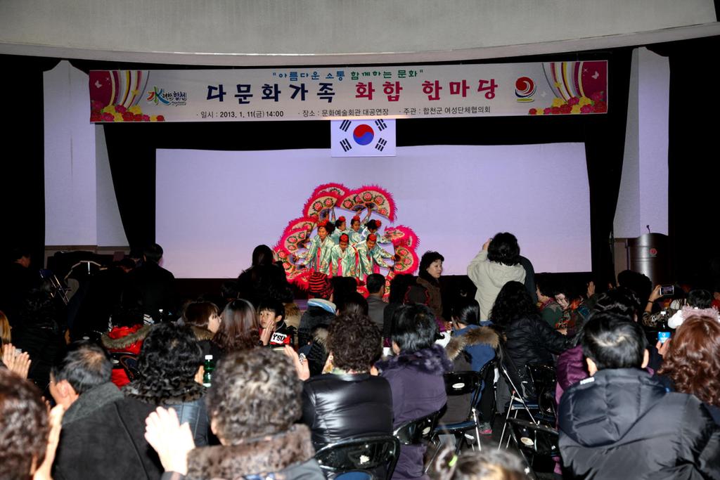 화합 한마당 행사는 오프닝공연을 시작으로 제1부 개회식 및 유공자 및 모범다문화가정 표창 수여, 회장인사말씀, 군수, 군의장 축사, 제2부 다문화가족 장기자랑, 여성단체와 다문화가족간의 화합한마당행사로 진행 되었으며, 오프닝 공연은 합천초등학교 재학중인 다문화가족자녀 10명으로 구성된 기타동아리의 공연과 야로중학교 2학년 5명의 화려한 방송댄스, 여성결혼이민자 8명이 부채춤과 싸이의 강남스타일을 선보이며 우리는 하나라는 메시지로 화려한 축하무대를 열었다.