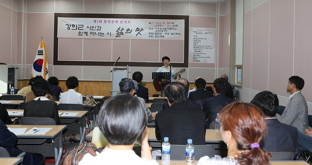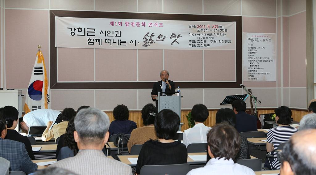 이번 콘서트는 노찾사 조경주 가수의 오프닝 공연을 시작으로 한국 현대시의 거장 강희근 교수의 ’시인과 함께 떠나는 시’와 ‘삶의 맛’을 주제로 문학특강이 있었고 특강 중간에 쉬어가는 코너로 노래와 시낭송 시간을 가져 모처럼 합천에 문학과 예술의 향연이 펼쳐졌다.