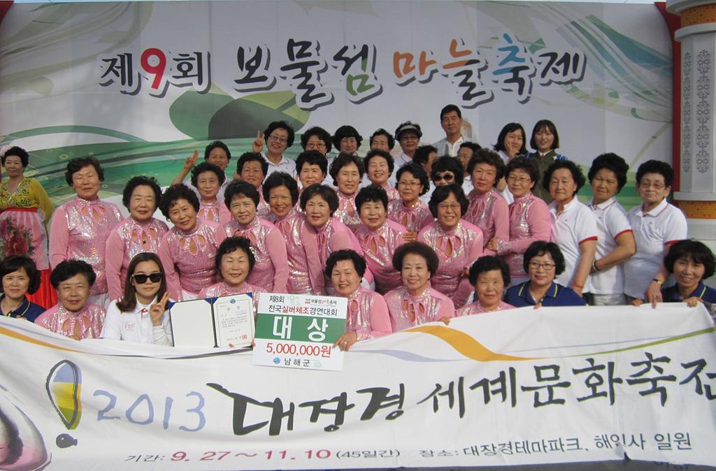 남해 보물섬 마늘축제 기간 중에 개최된 이번 경연대회는 전국 19개팀 1,500여명이 참가하여 열띤 경연을 벌였으며 최우수상은 충남 금산군보건소 두지리팀, 우수상은 대구 북구보건소 목련팀이 수상하였다.
