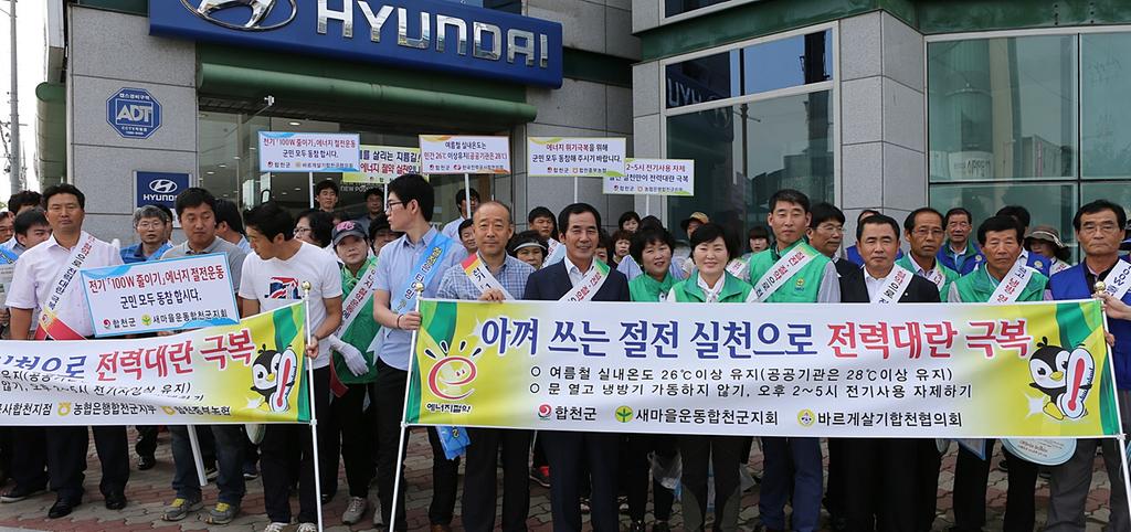 합천군(군수 하창환)은 27일 합천경찰서, 한국전력공사 합천지사, 농협은행 합천군지부, 합천중부농협과 민간단체인 새마을운동 합천군지회(회장 윤정호), 바르게살기합천군협의회(회장 김방현)와 민ㆍ관 합동으로 에너지절약 가두 캠페인을 합천읍 시내에서 실시하였다.
