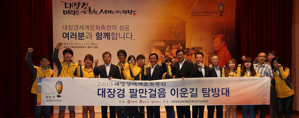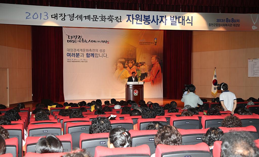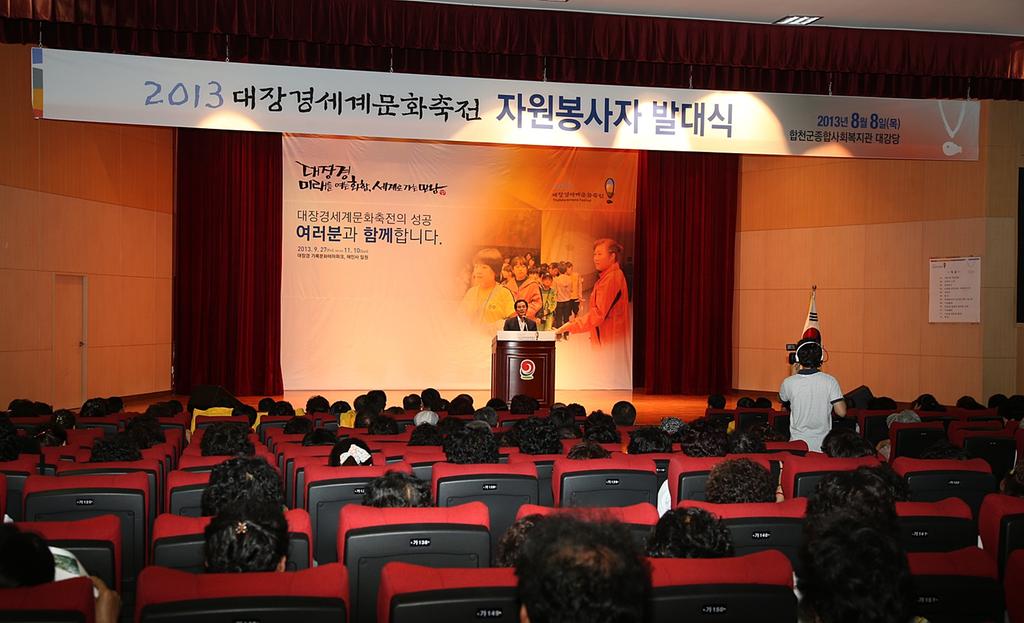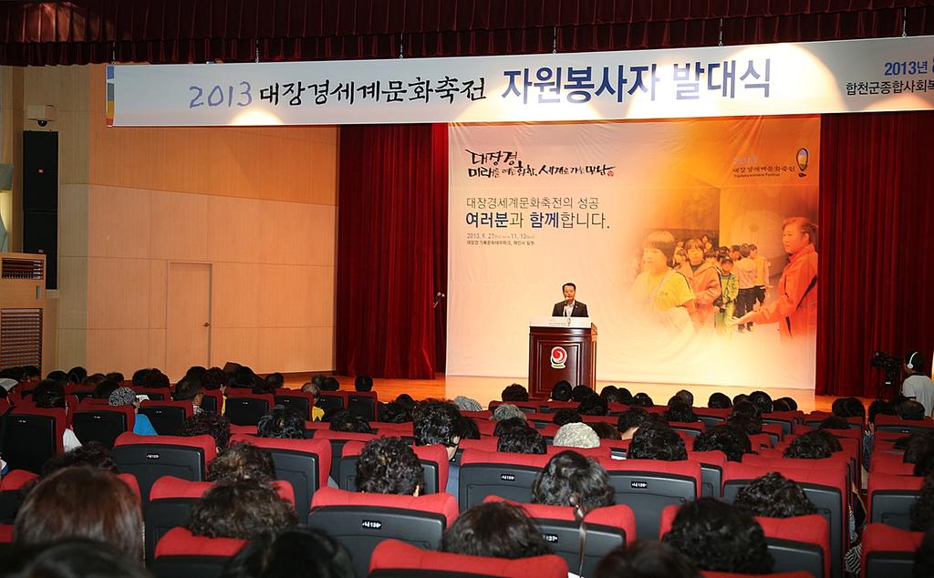 합천군은 2013 대장경세계문화축전의 성공적인 개최를 위하여 8월 8일 오후 2시 합천군 종합사회복지관에서 하창환 합천군수, 허홍구 합천군의회 의장, 군의회의원, 윤창수 경찰서장과 관내 사회단체장이 참석한 가운데 대장경세계문화축전 자원봉사자 발대식을 개최했다.