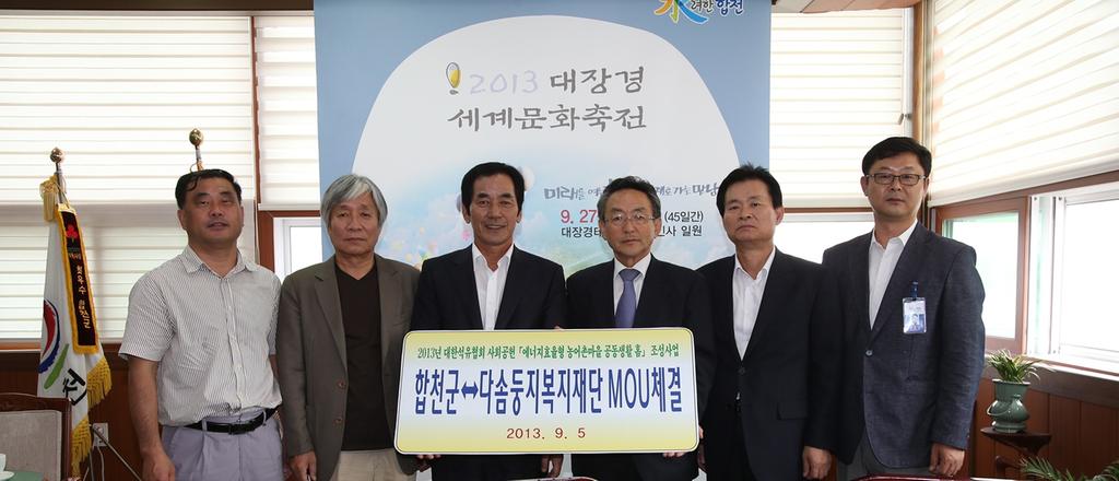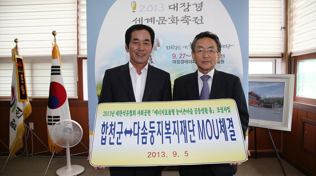 합천군(군수 하창환)은 지난 5월 신청한『에너지 효율형 농어촌마을 공동생활 홈』조성 공모사업에 선정되어 다솜둥지복지재단(이사장 이상정)과 업무협약을 체결하고 사업비 1억 1천 5백만원을 지원 받게 되었다고 5일 밝혔다.
