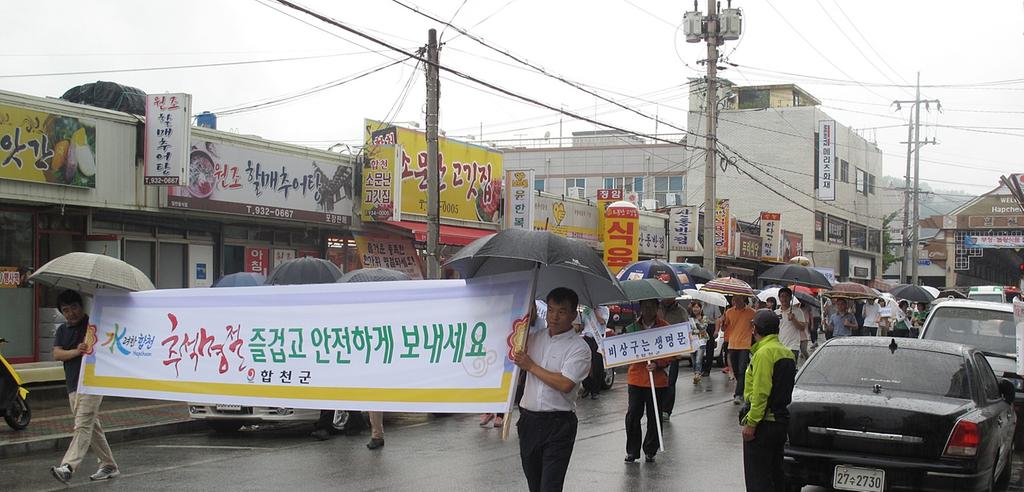합천군은 12일 이화예식장 앞에서 합천경찰서, 합천소방서, 합천읍 주부민방위기동대와 군청직원 등 150여명이 참석한 가운데 ‘즐겁고 안전한 추석보내기’ 안전캠페인을 실시하였다.