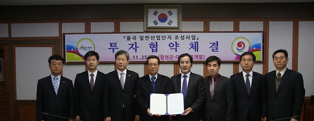 합천군은 25일 합천군청 소회의실에서 『율곡 일반산업단지 조성사업』의 우선협상대상자로 선정된 주식회사 대경산업개발(이하 ‘대경산업개발’)과 투자양해각서(MOU)를 체결했다.