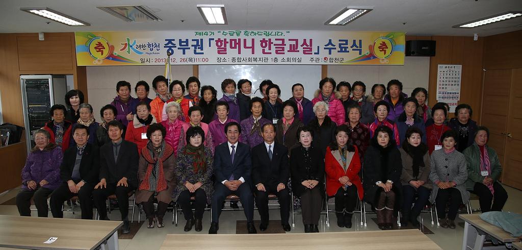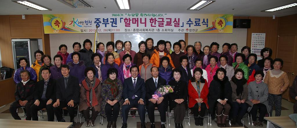 합천군은 할머니 한글교실을 권역별로 확대 운영하여 23일, 26일 양일간 하창환 군수, 문준희 도의원, 허종홍 부의장 및 군의원, 박현정 여성단체협의회장, 정경선 정심회장, 최옥희 한국부인회회장 및 수료생 180명이 참여한 가운데 수료식을 가졌다.
