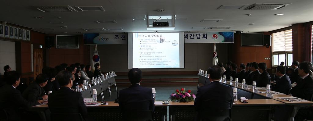 하창환 군수는 “지역 현안과제와 내년도 국비 확보대책 등을 협의하기 위해 조현룡 국회의원을 모시고 정책간담회를 갖게 되어 무척 기쁘게 생각한다.” 며, “지역 숙원사업 해결에 세심한 배려와 관심으로 국·도비 확보에 많은 협조를 요청한다.”고 덧붙였다.