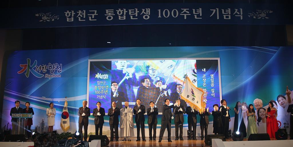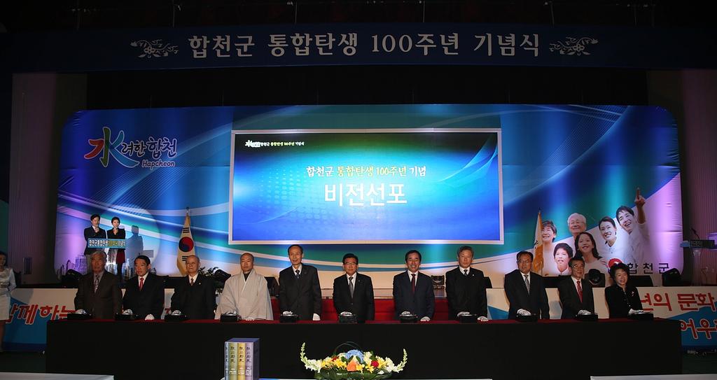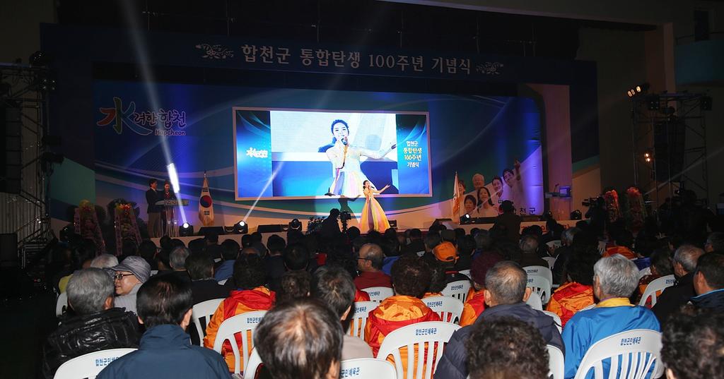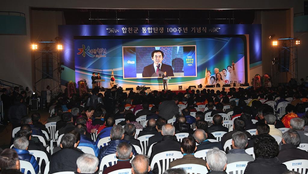 군은 합천군 통합 탄생 100주년을 맞이하여 역사의 발자취를 돌아보며 합천인의 자긍심과 애향심을 높이고, 천년의 미래를 군민과 함께 달려가기 위한 군민 화합의 장을 마련하고자 28일, 군민체육관에서 하창환 군수, 문준희 도의원, 허홍구 의장 및 군의원, 재외향우, 군민 등 1,000여명이 참석한 가운데 기념식을 개최했다.