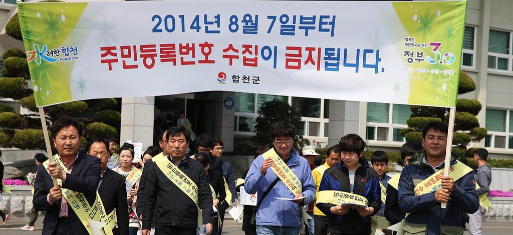 합천군은 4월 16일 오후 2시부터 군청광장에서 개인정보보호 결의문을 채택하고 “개인정보보호법” 개정에 따른 ‘주민등록번호 수집 법정주의’ 홍보 가두 캠페인을 유관기관 및 사회단체와 함께 합천시외버스터미널 등 일원에서 실시 하였다.
