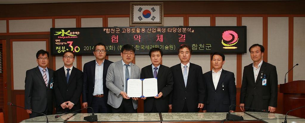 이날 체결식은 합천군수권한대행 김황규 부군수, 김 민 한국세라믹기술원장을 비롯한 관계자가 참석한 가운데 진행되었으며, 오는 5월 1일부터 2015년 2월말까지 10개월간 사업을 추진할 계획이라고 밝혔다.