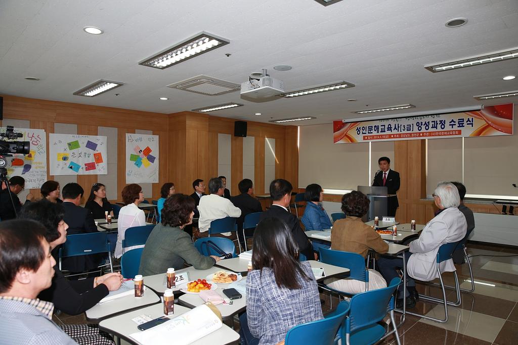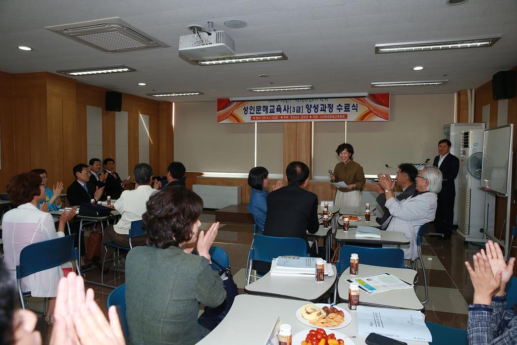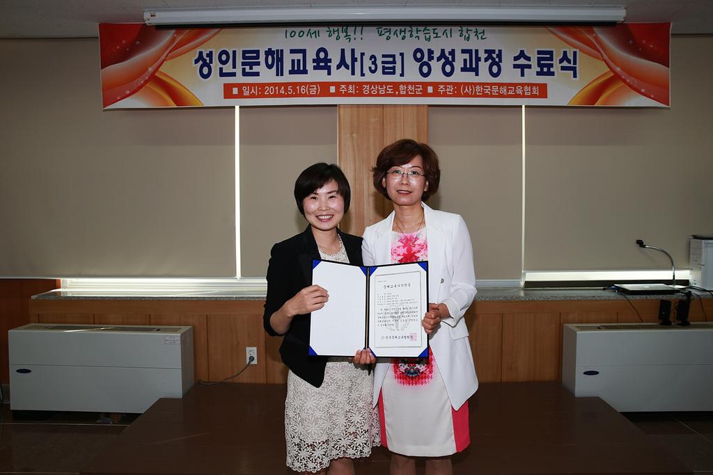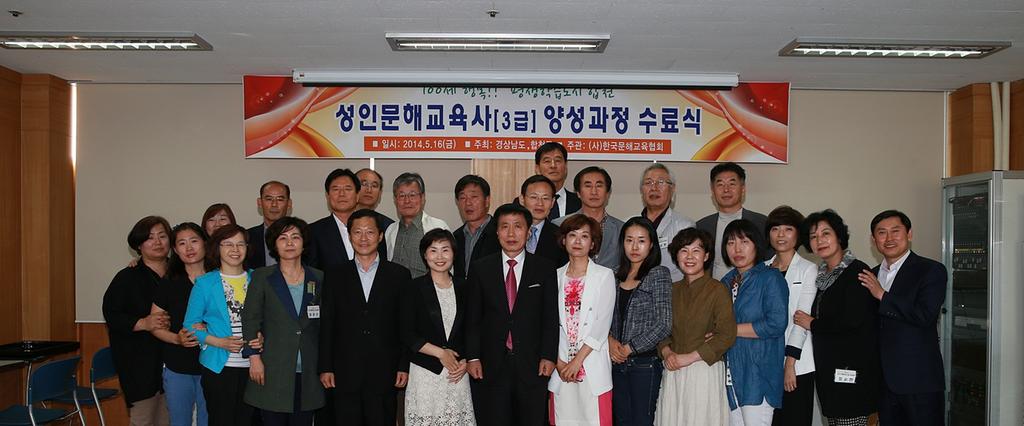 합천군은 16일, 종합사회복지관 5층 다목적홀에서 2014년도 상반기 성인 문해교육사(한글강사) 3급 양성과정 수료식을 가졌다.