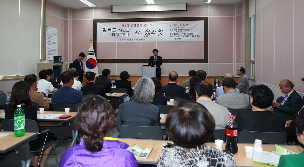 한국문인협회 합천지회(회장 김숙희)는 22일, 이주홍어린이문학관에서 합천군수 권한대행 김황규 부군수, 심재상 합천교육장, 손국복 한국예총 합천지회장과 합천의 시인, 소설가, 음악가 등 150여 명이 참가한 가운데 시, 음악, 문학특강이 어우러진 문학콘서트를 열었다.