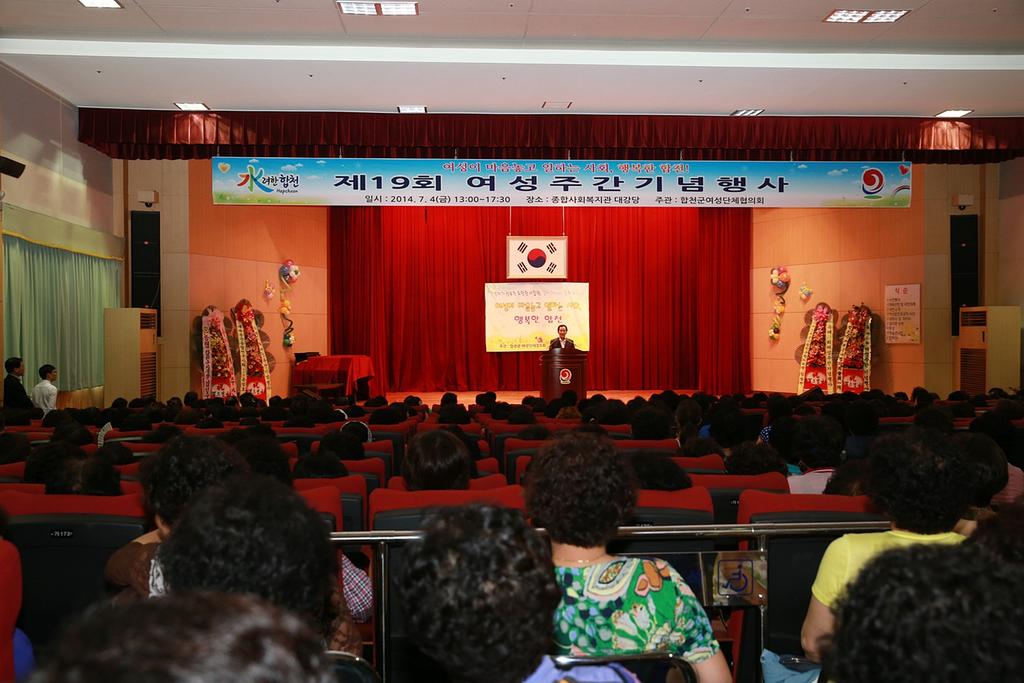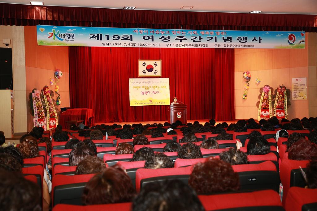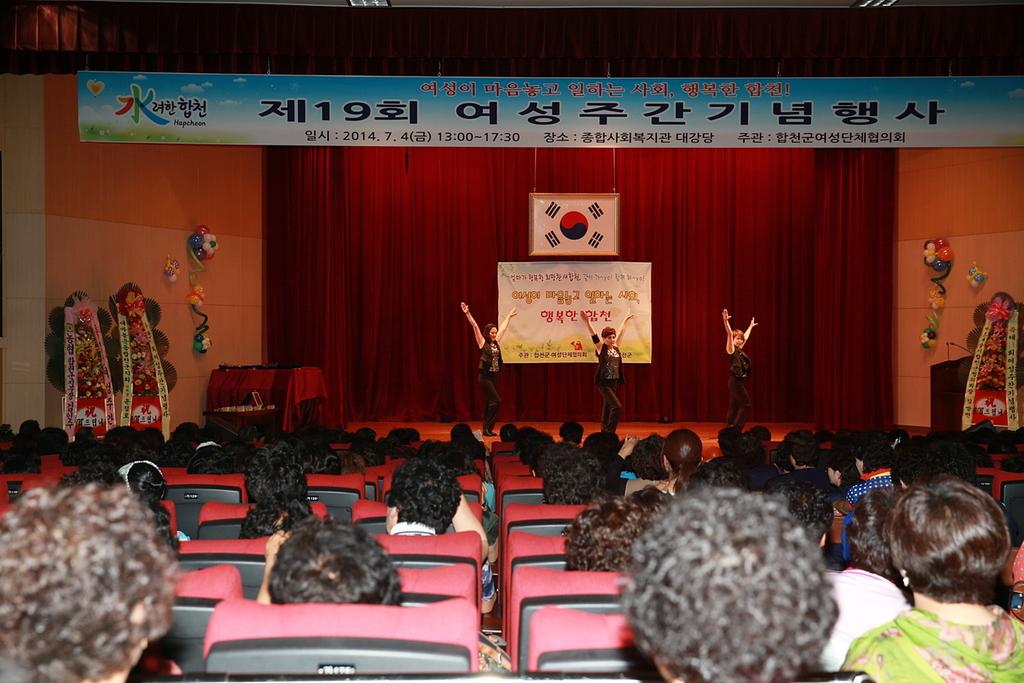 합천군여성단체협의회(회장 최옥희)는 지난 4일, 제19회 여성주간(7.1~7.7)을 맞아 하창환 군수, 여성단체회원 등 500여명이 참석한 가운데 ‘엄마가 행복한 희망찬 새 합천, 같이 가~yo! 함께 해~yo!’라는 슬로건으로 종합사회복지관 대강당에서 기념행사를 가졌다.