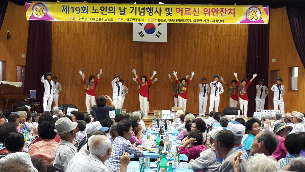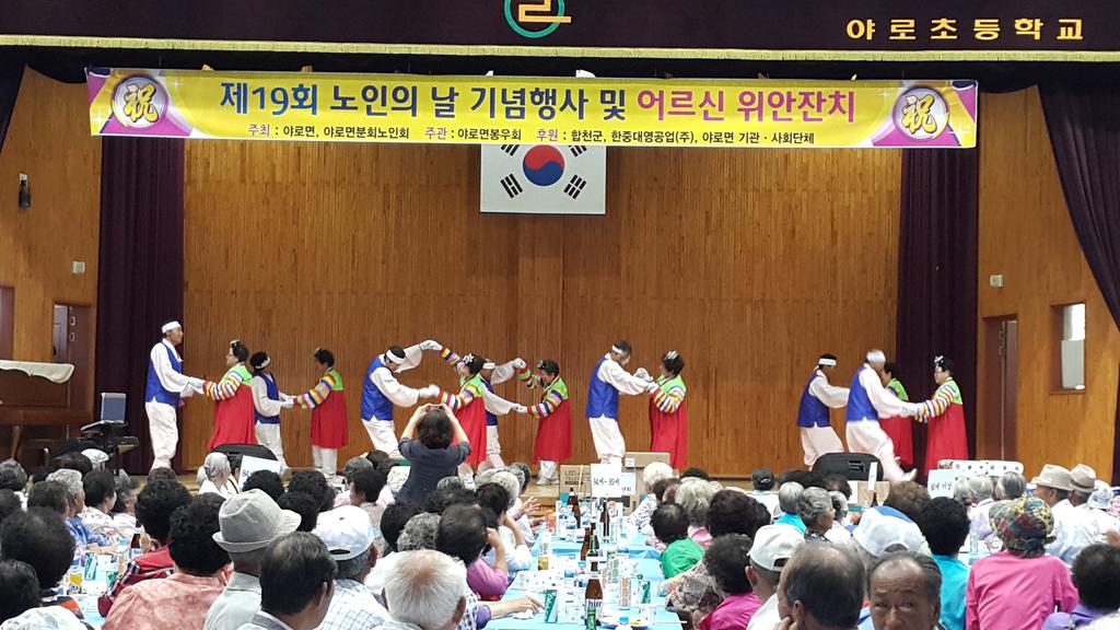 합천군 야로면 봉우회(회장 백성환)는 야로면 노인회분회(분회장 권대형)와 함께 28일 야로초등학교 체육관에서 하창환 합천군수를 비롯하여 조삼술 ․ 이창균 군의원, 정규현 면장, 진인성 민리민안국민연합 합천군지부장, 야로면 기관단체장 등이 참석한 가운데 800여명의 어르신을 모시고 제19회 노인의 날 기념식 및 어르신 위안잔치를 열었다.