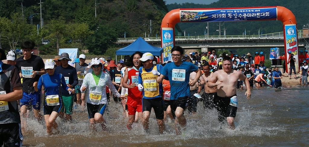 2015 황강레포츠축제에는 전국마라톤 동호인들의 무한 사랑을 받고 있는 국내 유일의 수중마라톤대회를 비롯하여 리버발리볼, 모래풋살, 민속씨름대회 등 다양한 스포츠 경기가 열린다. 특히, 한낮의 뜨거운 아스팔트가 아닌 시원한 물보라를 일으키며 1,700여명의 마라톤동호인들이 강변 백사장을 뛰는 이색적인 수중마라톤대회는 보는 이로 하여금 상쾌함과 청량감을 선사할 것이다.