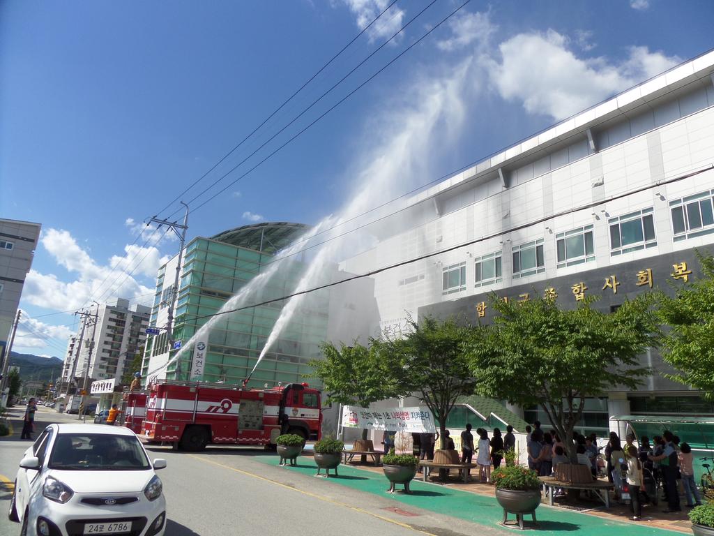 이어서 종합사회복지관 정문 앞에서 원인불명의 화재발생 가상훈련 사항을 설정하여 화재신고 및 상황전파, 대피훈련, 화재진압훈련, 인명구조 및 환자이동 등의 훈련을 합천소방서와 합동으로 병행하였다..