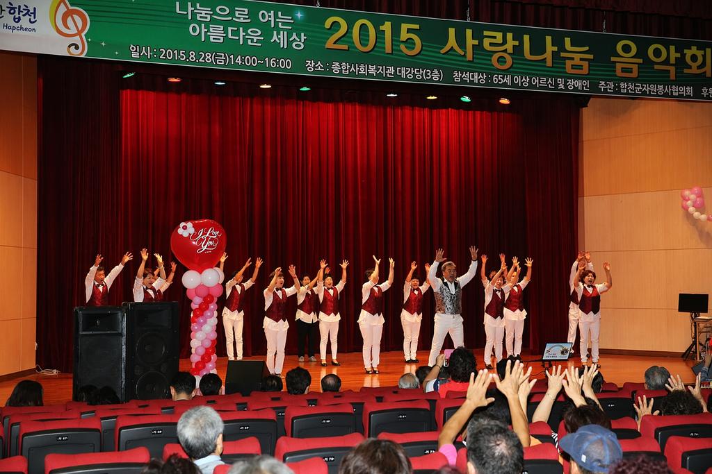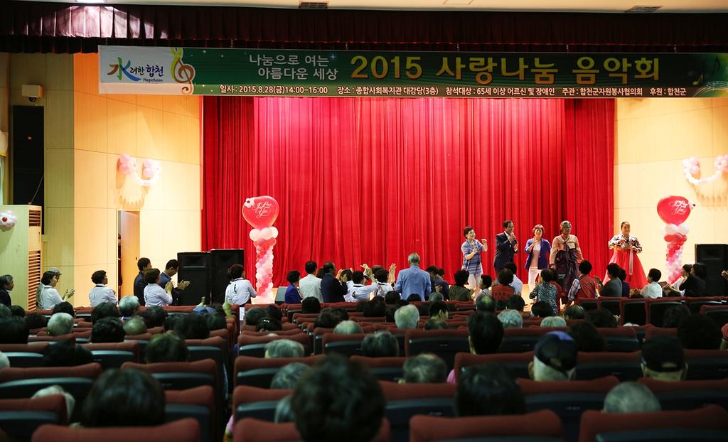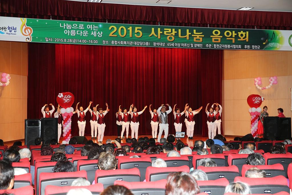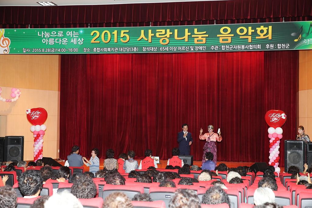지난 28일 오후 2시 합천군 종합사회복지관 대강당에서 합천군자원봉사협의회(회장 이순자)가 주관하고, 합천군(군수 하창환)이 후원하는 “2015 사랑나눔 음악회”가 열렸다. 이 자리에는 관내 66세 이상 어르신들과 장애인, 시설입소자 등 평소 문화생활이 어려운 분들과 하창환 군수, 허종홍 군의회 의장 외 의원들과 기관사회단체장, 자원봉사회 전직 회장들을 비롯한 약 500여명의 관객들이 자리를 가득 메운 가운데 웃음힐링공연, 각설이 공연, 초청가수(조아라, 보라) 공연 및 어울림 한마당 등이 펼쳐졌다.
