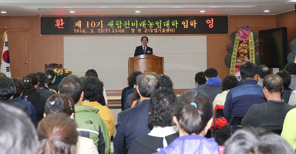 대학장인 하창환 군수는 환영사에서 “합천농업의 밝은 미래를 위해 그 어느 해 보다 더 야심찬 2개 과정을 운영하기에 과정별 교육을 성실히 이수하여 합천농업을 한단계 업그레이드 시키고 창조농업과 연결시킬 수 있는 농업전문리더자로 재탄생 될 수 있도록 최선을 다해달라”고 당부하였다.