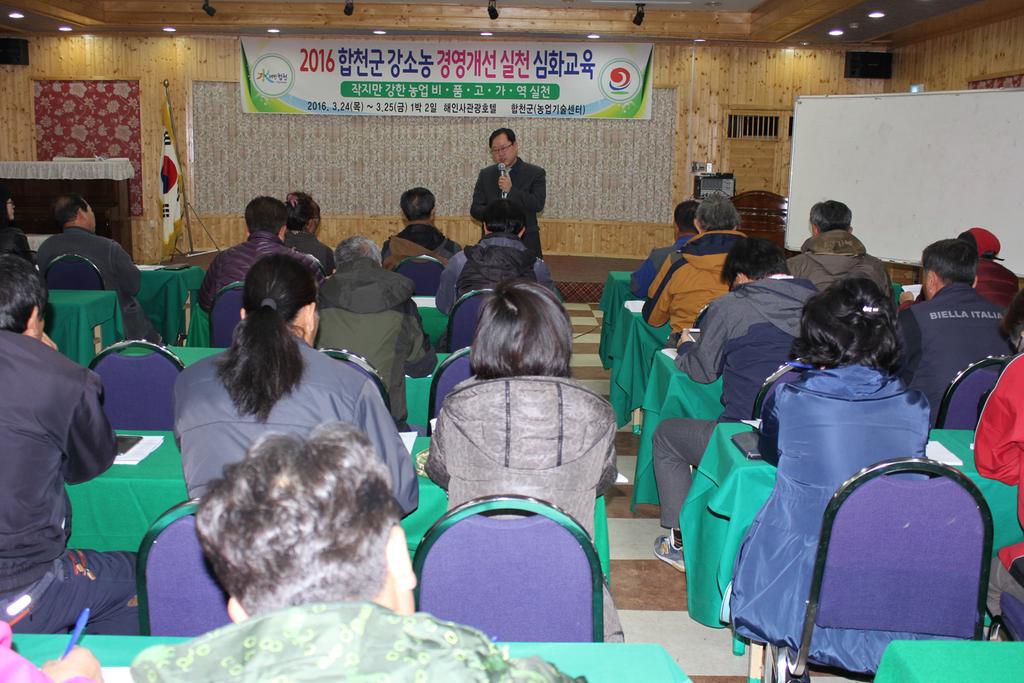 합천군에서는 농산물 수입 개방 확대에 대응하여 보조금 지원 위주의 정책에서 농가 스스로 비용절감, 품질향상, 고객확보, 가치창조, 역량개발 등을 통하여 농가가 스스로 자립할 수 있는 계기를 제공코자 기본-심화-후속 과정의 단계적 교육을 실시하고 있다.