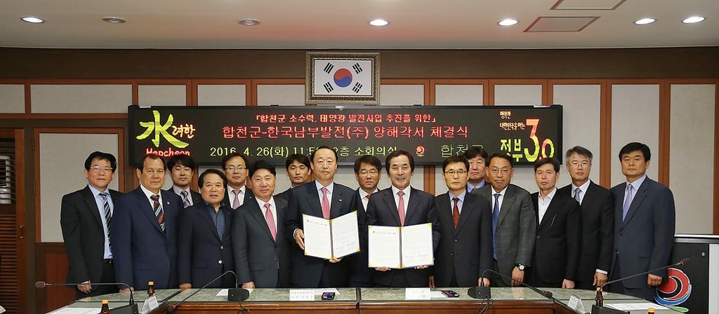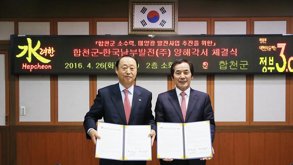 합천군(군수 하창환)은 26일(화) 오전 합천군청 소회의실에서 한국남부발전(주)와 소수력·태양광발전사업 추진을 위한 양해각서(MOU)를 체결했다.