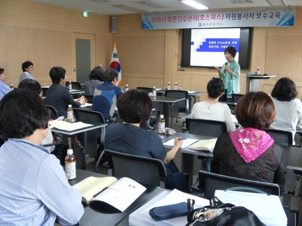 합천군(군수 하창환)은 26일 합천보건소 보건교육실에서 ‘방문건강관리 및 호스피스 자원봉사자 보수교육’을 마치고 수료식을 가졌다.